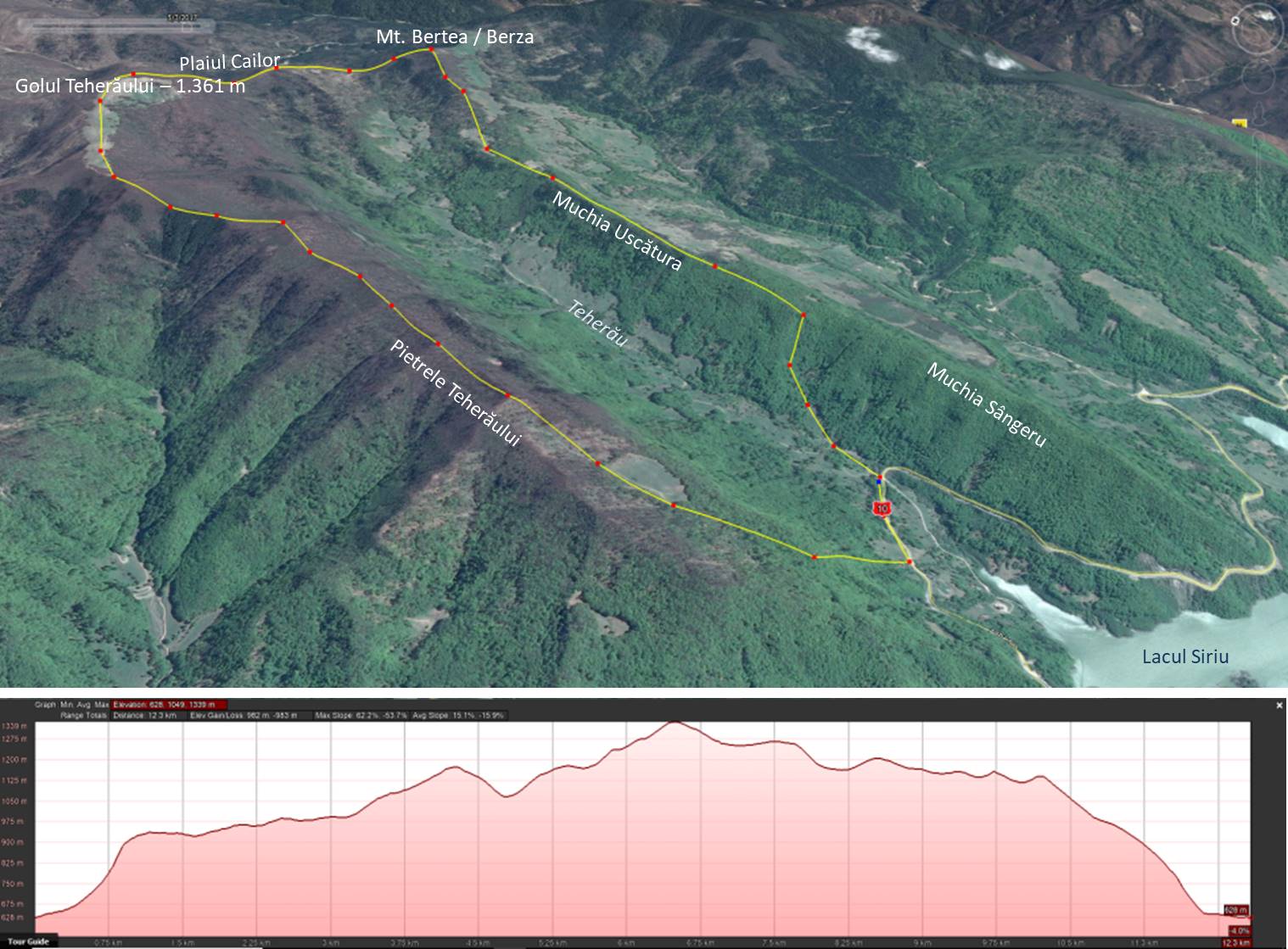 Traseu: Gura Teherăului – Șaua Sângeru-Uscătura – Muchia Uscăturii – Vf. Bertea – Plaiul Cailor – Golul Teherăului – Pietrele Teherăului – Gura Teherăului