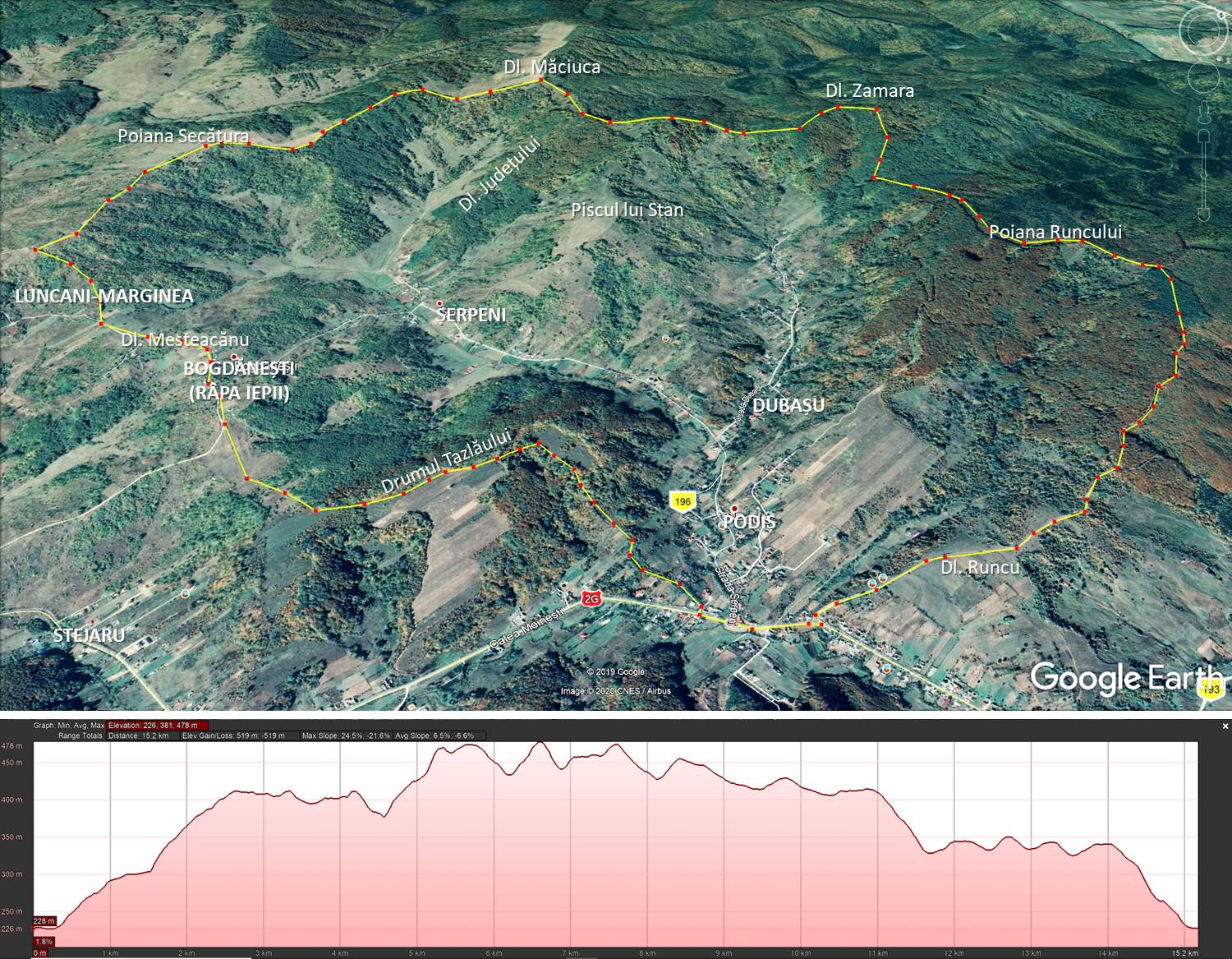 Traseu: Podiș – Dl. Runcu – Poiana Runcului – Dl. Zamara – Dl. Măciuca – Poiana Secătura – Sat Bogdănești – Drumul Tazlăului – Podiș