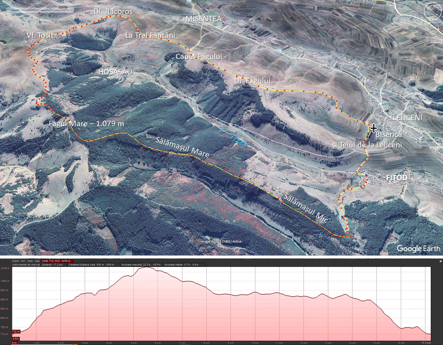 Traseu: FITOD – Sălămașu Mic – Sălămașu Mare – Vf. Fagu Mare – Vf. Tocit – Vf. Răcoros – La Trei Fântâni – Vf. Capul Fagului – Dl. Fagului – Biserica și Teiul de la Leliceni – FITOD