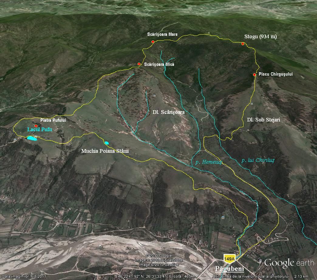 Traseu: Păgubeni – Poiana lui Tudorache – Piscu Chirguşului Plaiul Stogului Vf. Scărişoara Mare – Vf. Scărişoara Mică – Poiana Stânei – Piatra Pufului – trovanţii de la Piatra Pufului – Lacul Pufu – Muchia Stânei – Lacul de pe Muchia Stânei – trovanţii de sub Muchia Stânei – Păgubeni