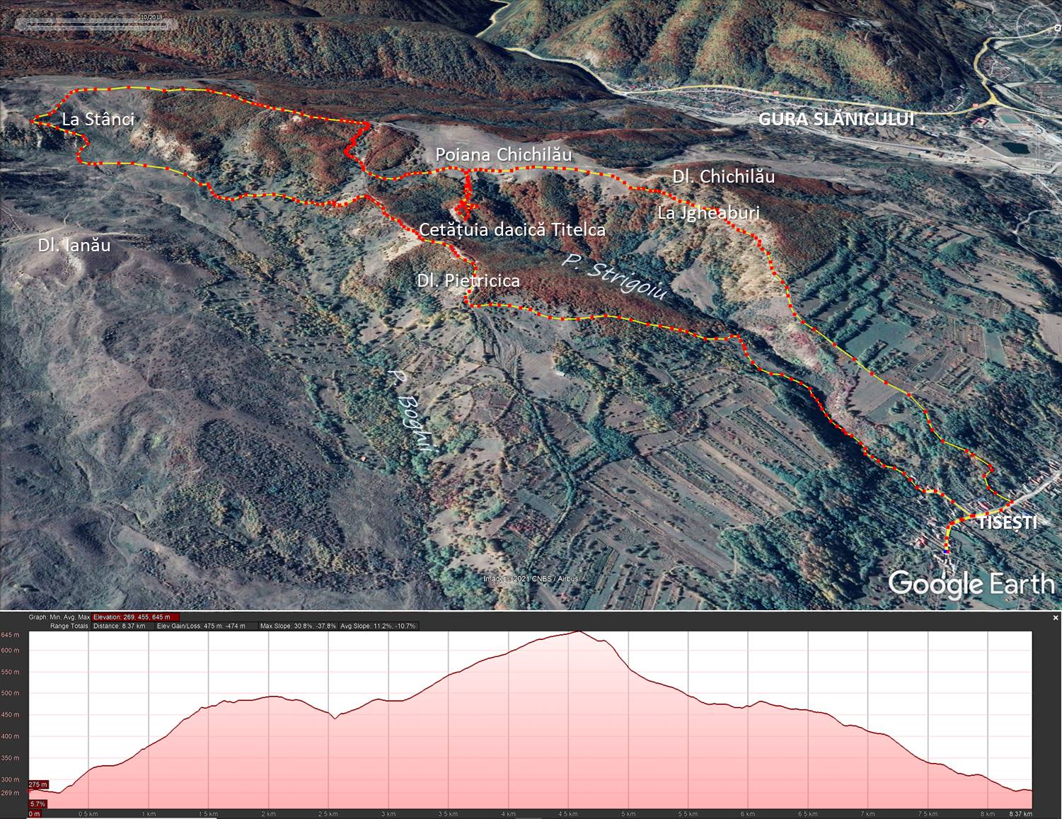 Traseu: Tisești (Gura Pârâului Strigoiu) – Dl. Chichilău (La Jgheaburi) – Poiana Chichilău – Cetățuia dacică Titelca – La Stânci – Pârâul Boghii – Dl. Pietriș – Valea Strigoiului – Tisești