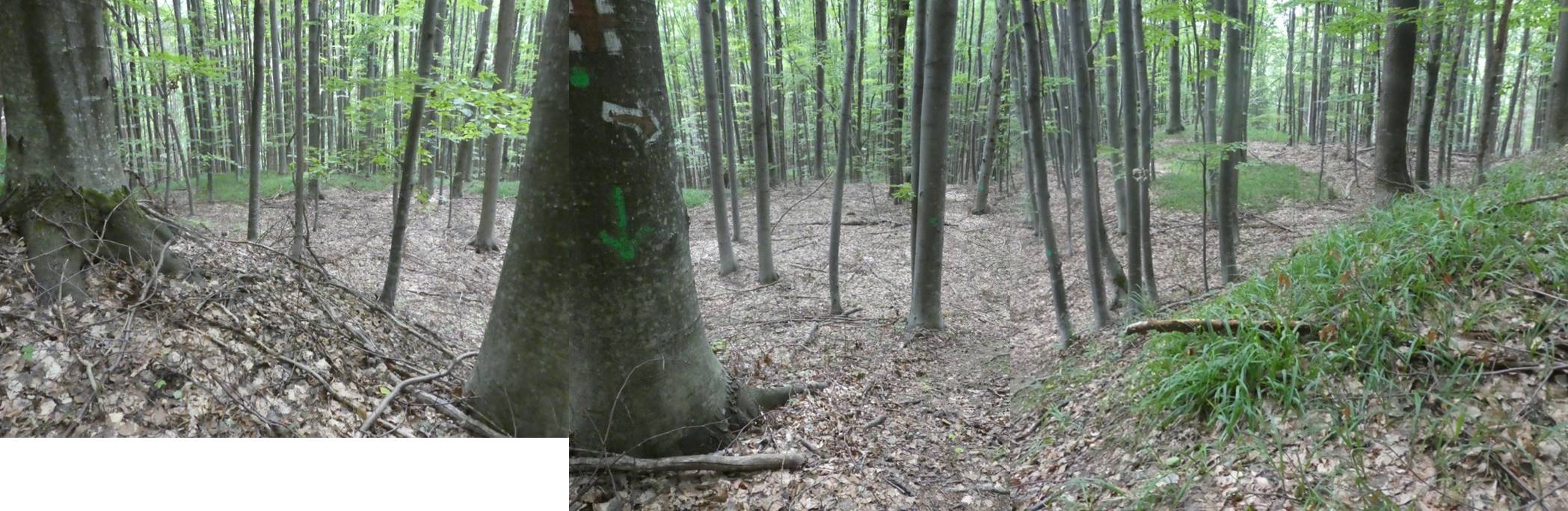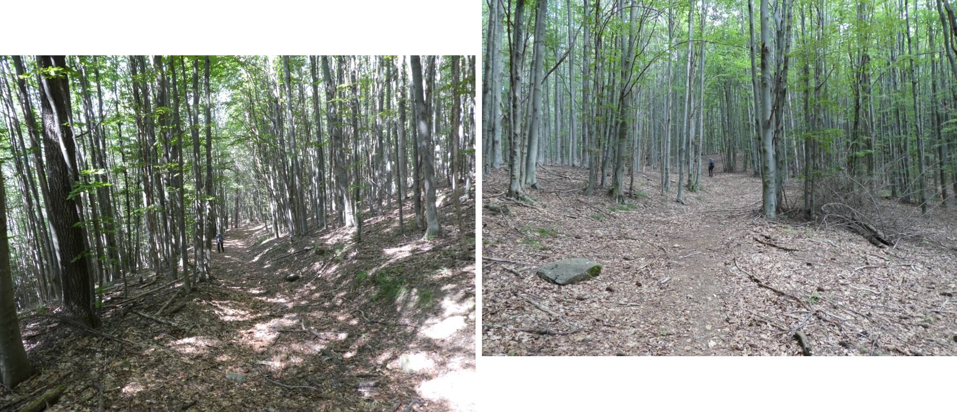 … de unde suim pe dâmbul de la vest de aceasta, intrând imediat în pădurea de fag ce acoperă Culmea Grădiștei. Ne înscriem pe cărarea ușor decelabilă de pe ea ghidați și de marcajul silvic, bandă roșie.