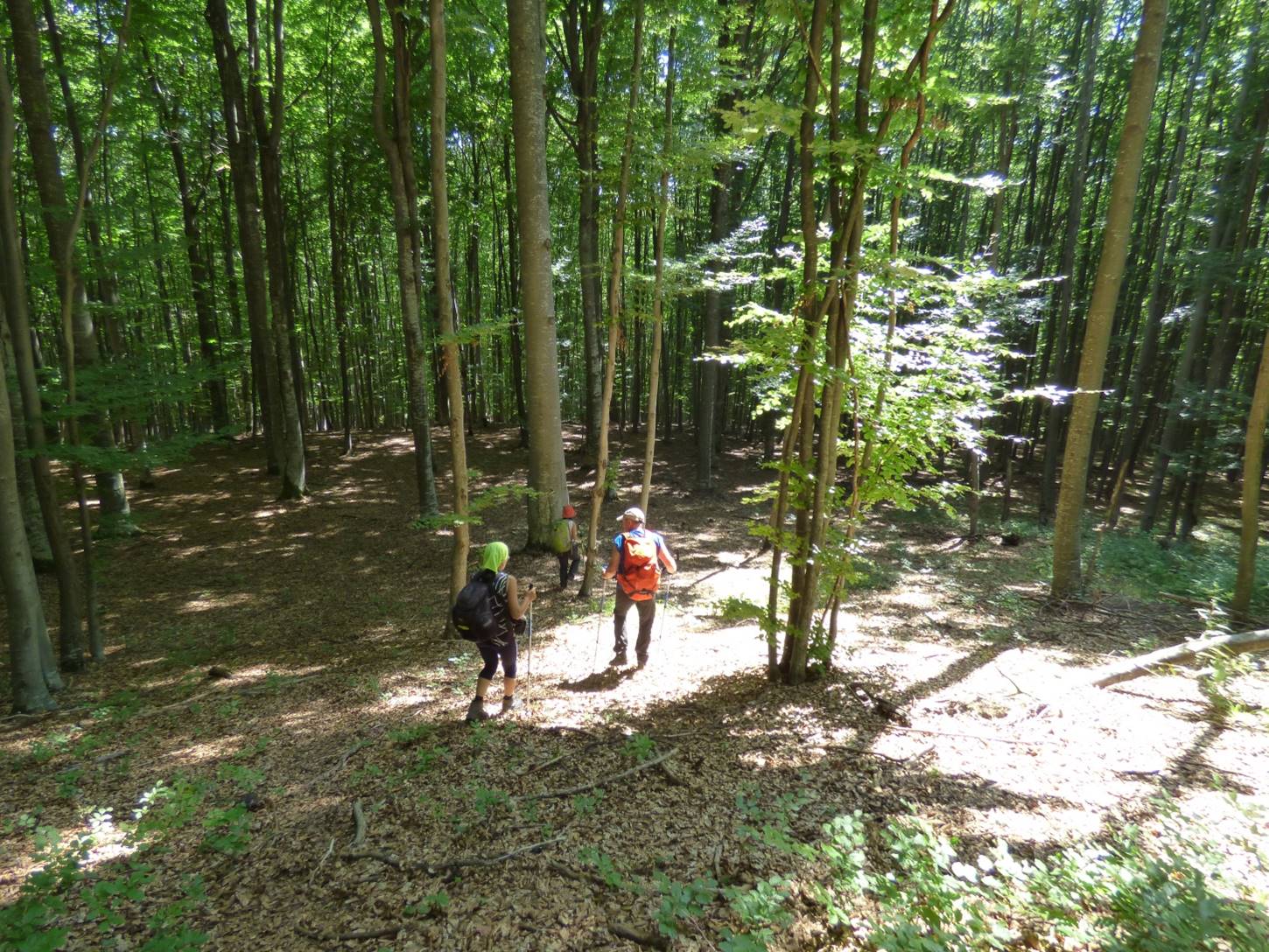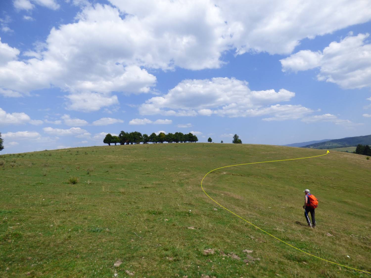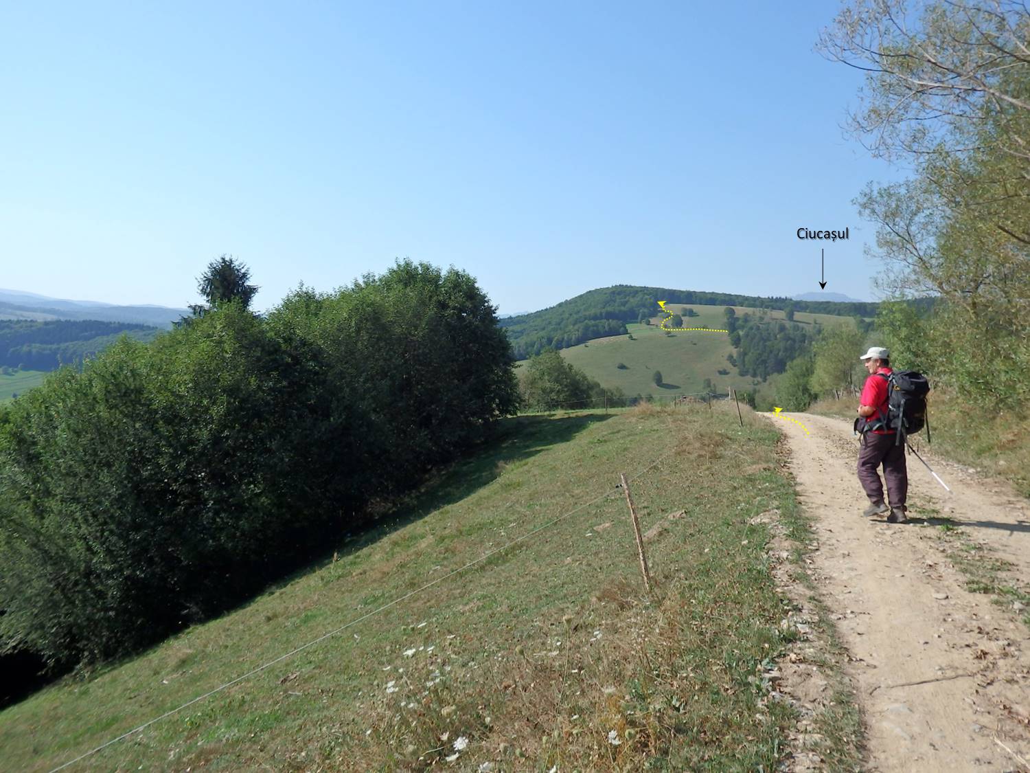 De dincolo de vârf (vest) traversăm o mică șa împădurită, dincolo de care drumul se arcuiește în urcuș ușor …