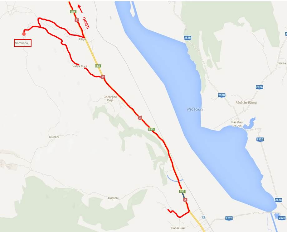 Pas 6: Șomușca – Bacău (4 km pe DC 165, asfaltat, stare bună, 20 km pe DN 2/E 85, stare f. bună) – Onești (52 km pe DN 11/E 574, stare relativ bună)