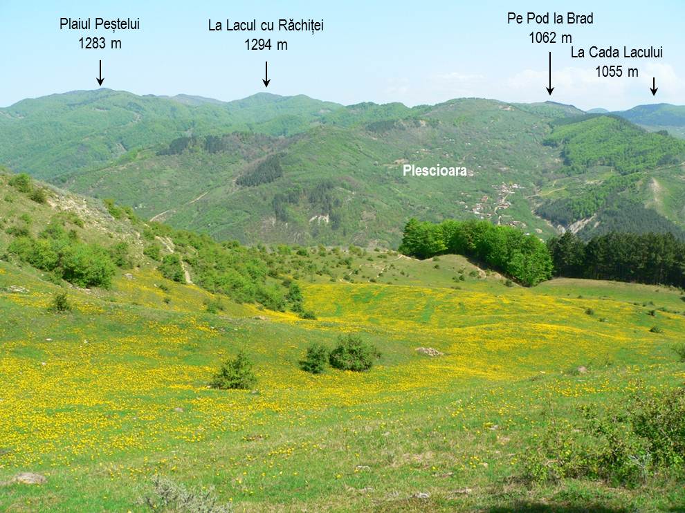 Ne atrag privirile, în egală măsură, covorul de păpădie de sub picioarele noastre și imaginea insolită a satului Plescioara (de Chiojdu) – cățărat pe pantele muntelui de dincolo de Bâsca Chiojdului, cu nume atât de neobișnuit: Pe Pod la Brad; la fel cum sunt și cele ale munților vecini !