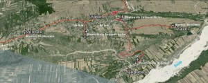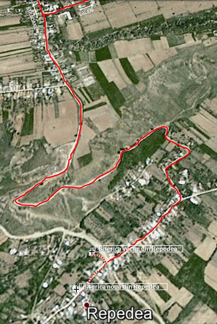 … din marginea drumului, avem o imagine de ansamblu a satului Repedea; printre case distingem turlele celor două biserici pe care le vom vizita.