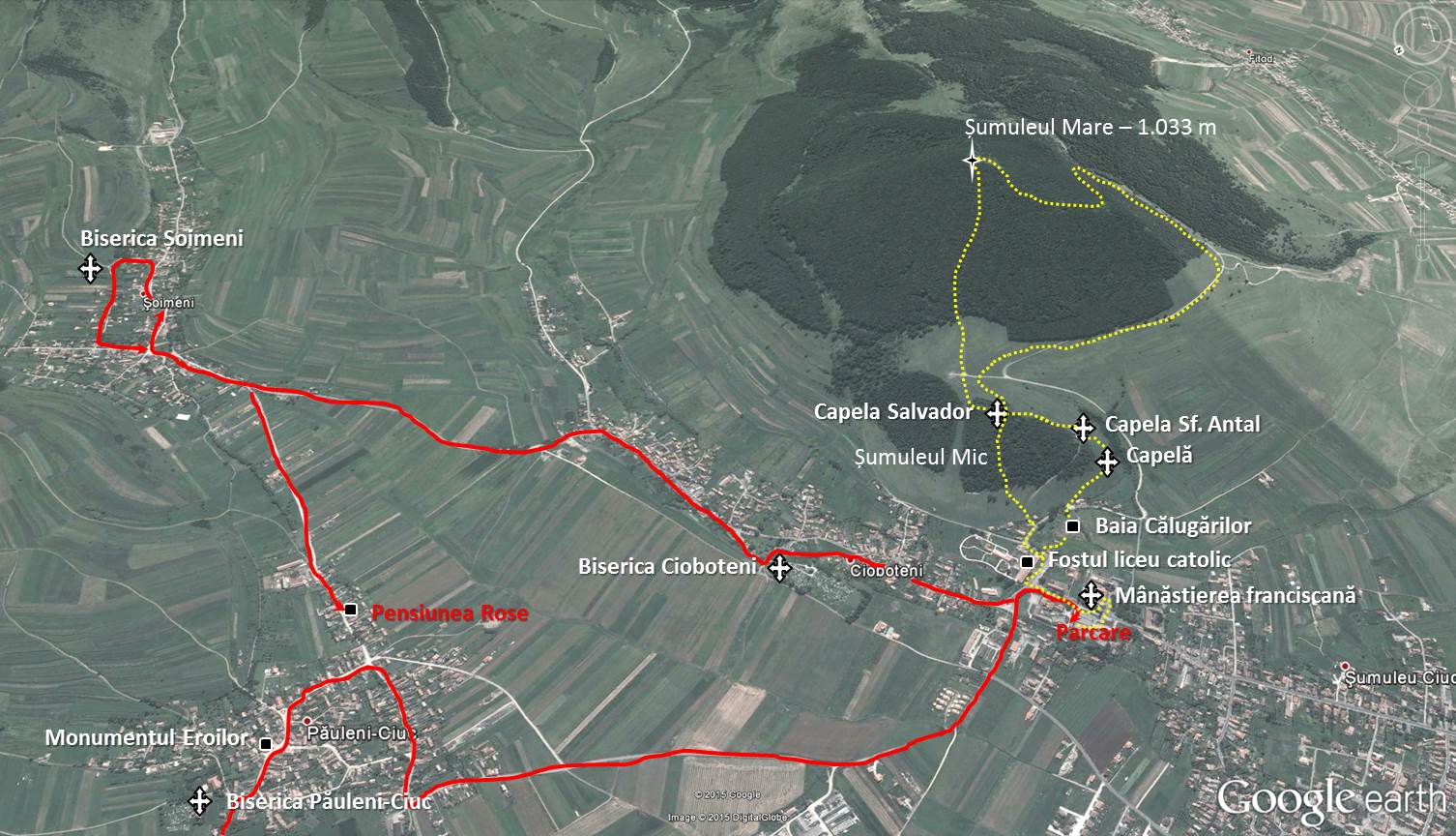 Traseu: Șumuleu-Ciuc [Mânăstirea franciscană, Baia Călugărilor] – Mt. Șumuleul Mic [cele 3 capele] – Vf. Șumuleul Mare – Mt. Șumuleul Mic [Drumul Crucii] – Biserica Cioboteni – Biserica Șoimeni – Păuleni-Ciuc [Pensiunea Rose]