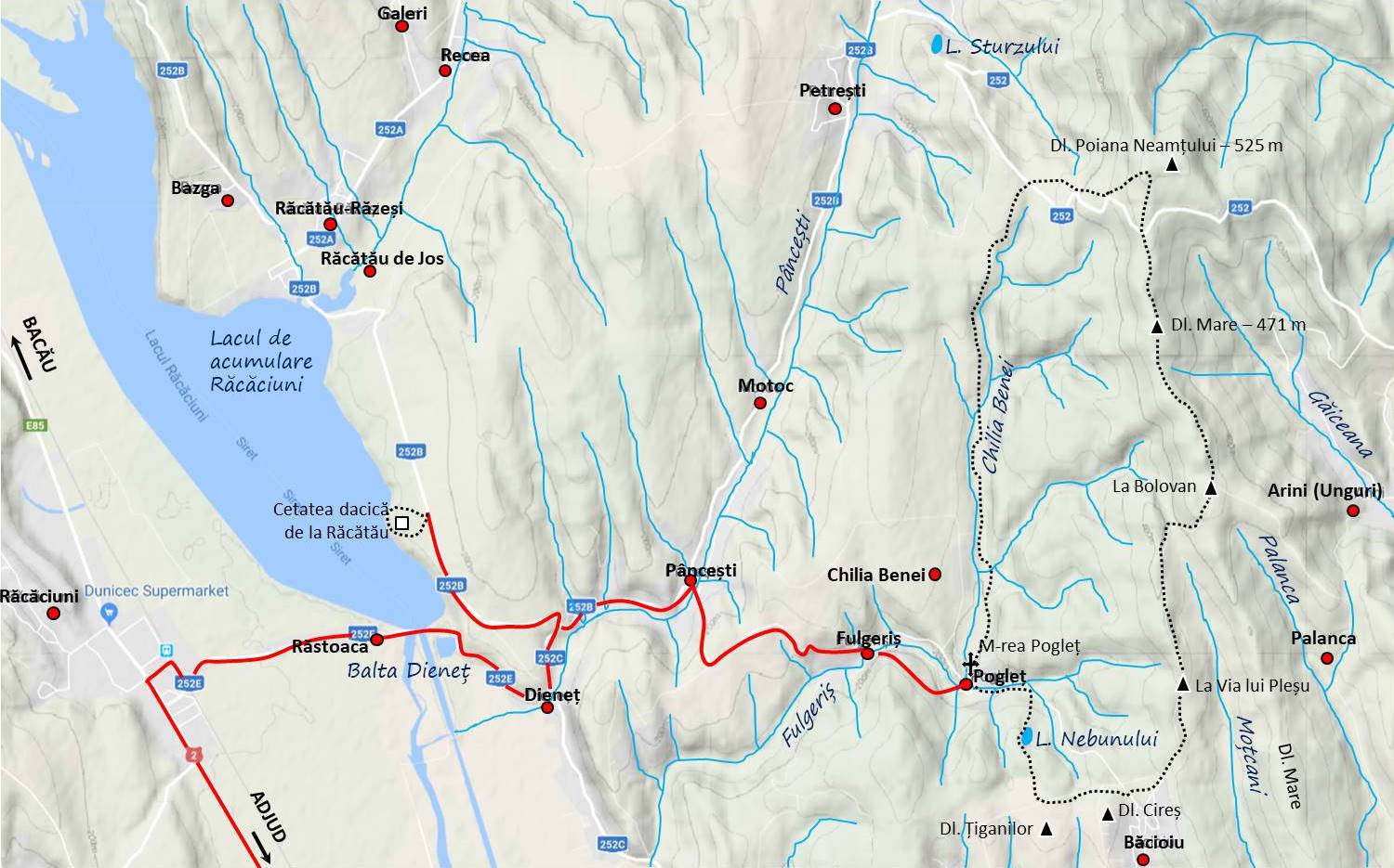 Traseu auto (final): DN 2 (Răcăciuni) – Dieneț (6 km pe DJ 252E & 252B, asfaltați, stare bună) – Cetatea dacică de la Răcătău – Dieneț (2,5 km dus/întors pe DJ 252B, drum de pământ, stare proastă) – Pâncești – Pogleț (7 km pe DJ 252B & DC 96, asfaltați, stare bună)