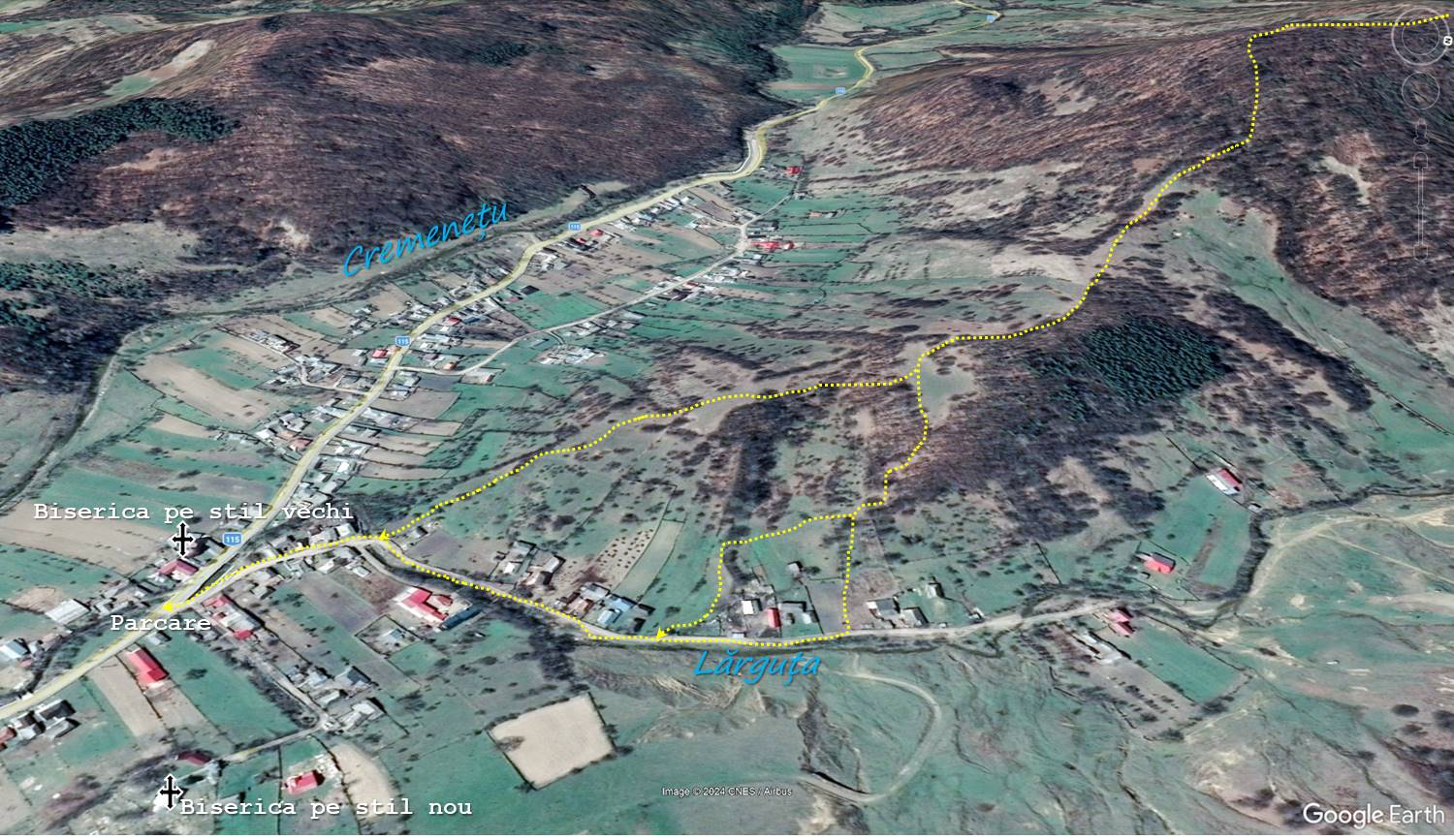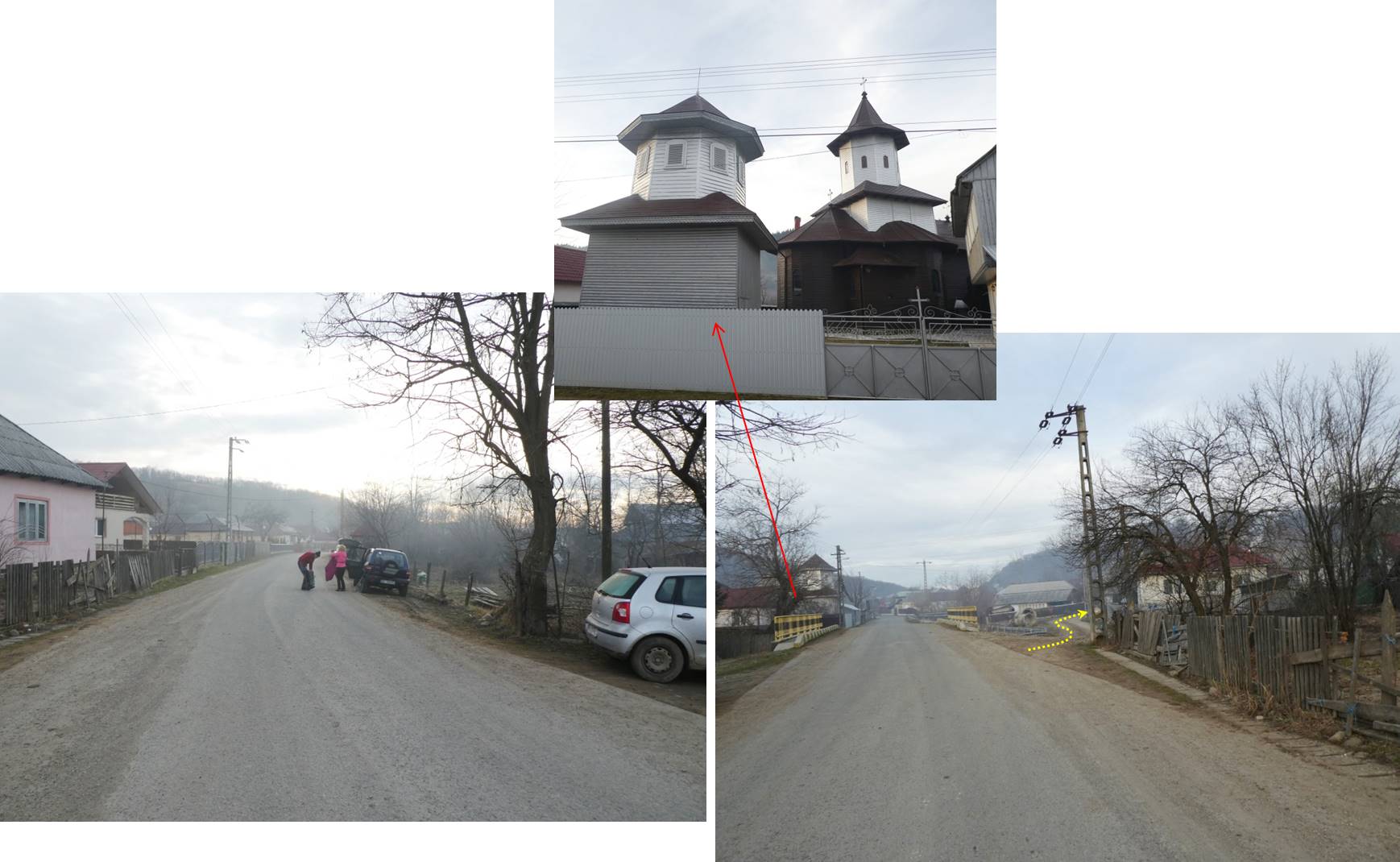 Ca să ajungem acolo, abordăm ulița (Str. Bisericii) ce pleacă spre dreapta de lângă pod; vom reveni aici pentru a intra în traseul propriu-zis urmând ulița care ține firul văii Lărguței.