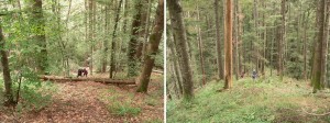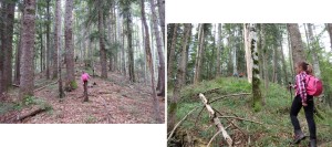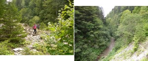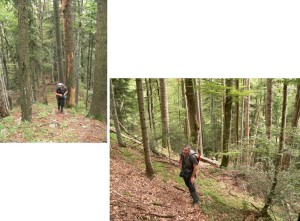 … pentru a ne instala pe Talpa Tisarului. Când punctul albastru, după 45 min de la Vf. Râpa Roșie, cotește brusc spre stânga (ducând, probabil, în valea Putnei), noi cotim, …la fel de brusc, spre dreapta, coborând, pe o potecă lată și încă destul de clară, cândva marcată și ea cu punct albastru, …