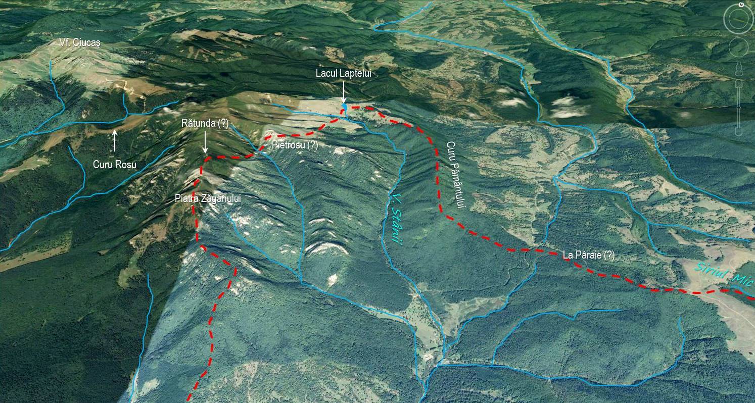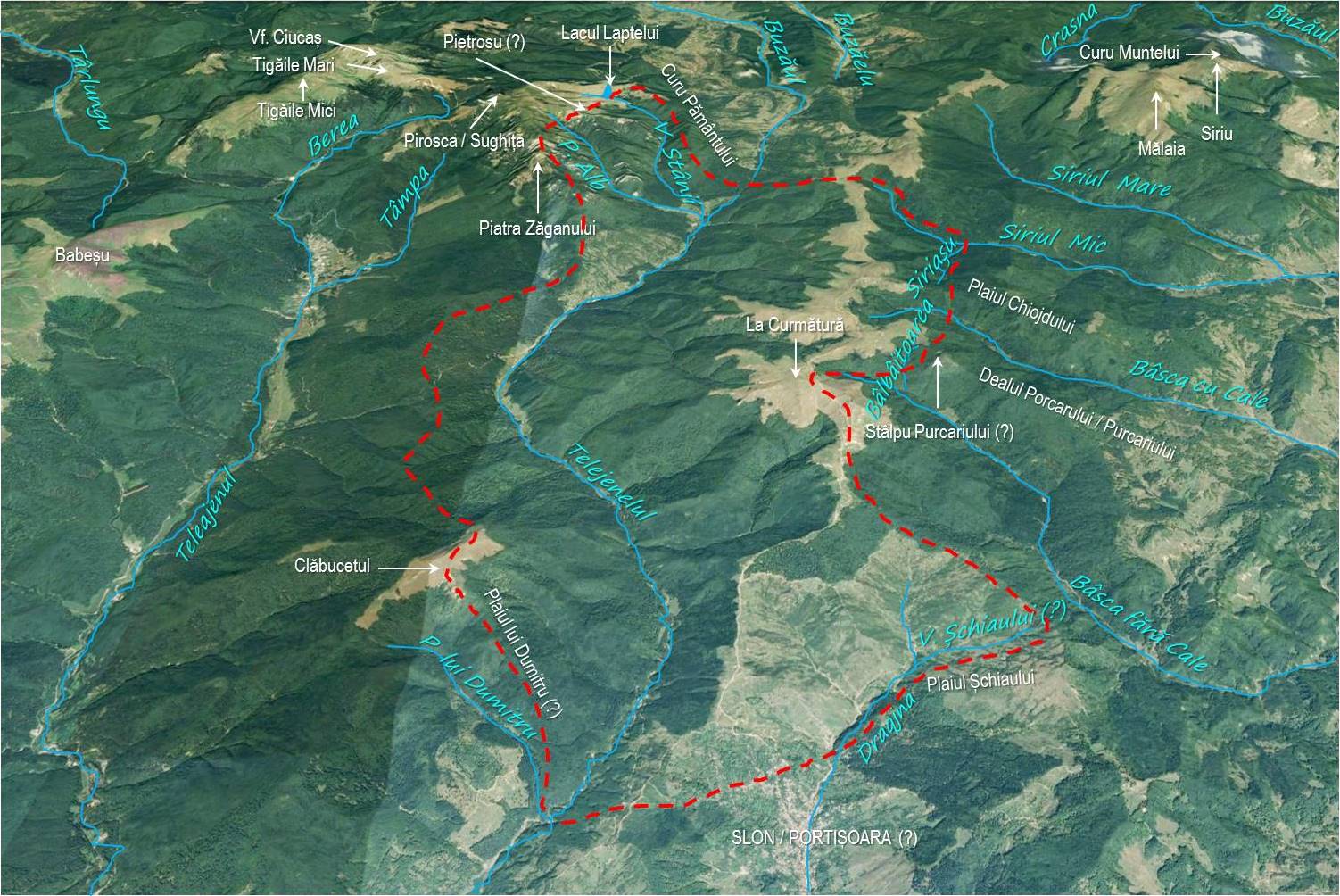 Referindu-se strict la reperele ce țin de masivul Ciucaș (subtextul bolduit), Vlad Chindea identifică “vârful Pietrosu” cu vârful Ciucaș, după o încercare, în cea mai mare parte, nereușită de a localiza pe teren, în termeni actuali, reperele esențiale precizate mai sus: Curu Pământului și Lacul Laptelui, pe care le translatează nicăieri sau mult prea departe față de poziția lor reală. Astfel, Curu Pământului nu e deloc un toponim … vag cum pare a se deduce din cele spuse de Vlad Chindea (“frontieră, capătul proprietății” – deși, zicem și noi, conduce la această semnificație), ci, este unul ce se referă, extrem de sugestiv(10, la o formă de relief precisă, în cazul de aici(11, credem noi, Șaua Boncuța. De altfel, pe două hărți austro-ungare (a doua ridicare topografică austriacă, din 1806-1869 – vezi nota 10 – și harta Regatului Ungariei din 1869-1887 – vezi nota 15) Curul Pământului este numită culmea ce pleacă spre nord-vest din Pasul Boncuța(12, cea cunoscută azi sub numele de Culmea Albiilor (dacă am presupune că, aici, “albii” = “văi”, am putea căuta în vecinătate Pâraele, mai ales că pe aproape există și …Valea Albiilor(13 !). În cotul pe care culmea Albiilor = Curu Pământului îl face brusc spre vest, se află un mic lac din care se scurge la … supraplin (la topirea zăpezilor sau după ploi … diluviene) un firișor de apă spre Valea Stânei (numită pe o hartă austro-ungară(14 “Valle Lac” !); vârful ce străjuie dinspre nord cuveta lăculețului e numit Laptele(15 ! Putem crede că aici se află Lacul Laptelui ? Împingerea celor două repere mult spre vest nu se justifică nici din alt punct de vedere: analizându-le pe toate celelalte din textul extras din documentul istoric pomenit vom constata o densitate constantă a acestora raportată la teren, iar localizarea unora în conformitate cu ipoteza lui Vlad Cândea ar afecta flagrant acest criteriu de … uniformitate teritorială ! Din același motiv, apreciem că vârful Pietrosu nu poate fi căutat nicidecum pe culmea Tigăile Mari – vf. Ciucaș, ci îl vom localiza pe ceea ce azi numim Culmea Stâncoasă – fiind, de altfel, singura, realmente, așa cum îi spune numele (și aproape ca semnificație de adjectivul “pietros”) și cel mai sau cât de cât, aproape de Lacul Laptelui; celelalte repere urmează firesc: Rătunda, este, zicem noi, fie nodul orografic în care Culmea Stâncoasă se racordează la Culmea Gropșoarele, fie chiar Vf. Gropșoarele (mai degrabă(16), Piatra Zăganului poate fi oriunde pe Culmea Zăganu(17, Vârful Rudelor și Măgura Vițeilor sunt pe undeva (încă n-am putut dibui unde), pe culmea dintre Culmea Zăganului și Clăbucetul Mâneciului, Șările Clăbucetului reprezintă, fără îndoială, Clăbucetul Mâneciului, iar Plaiul lui Dumitru este versantul stâng – credem noi, dar poate fi și cel drept – al văii, numite și azi așa, a lui Dumitru, care izvorăște de sub Clăbucetul Mâneciului și se varsă în Telejenel.