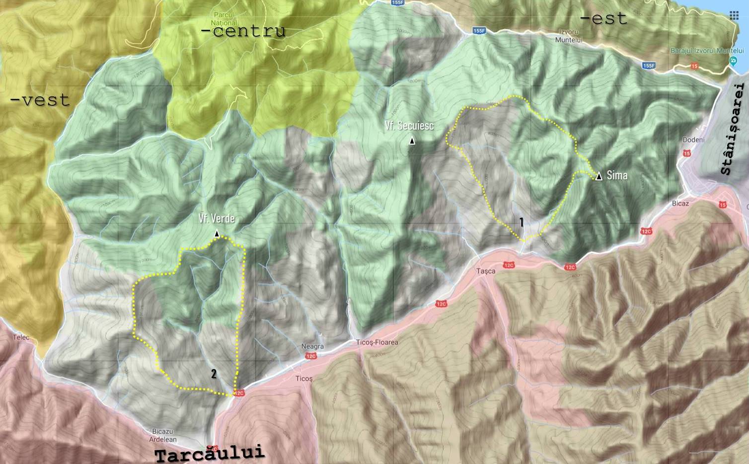 2. Bicazu Ardelean (Gura Chișirigului) – Mt. Chișirig – Vf. Arșiței – Vf. Verde – Culmea Făgețelului – Vf. Făgețel – Mt. Caprei – Mt. Mărului – Gura Chișirigului (**)