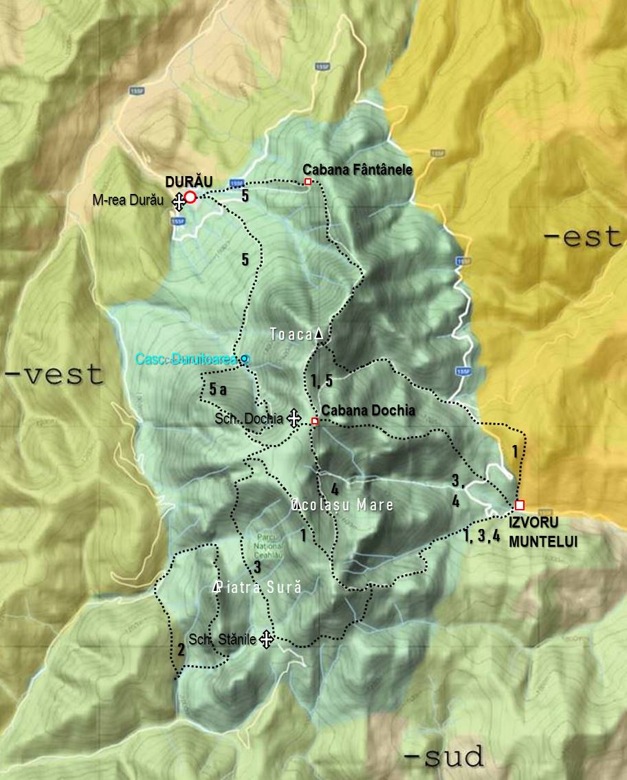 5.a. Durău – Poiana Viezuri – Cascada Duruitoarea – Poiana lui Iosăv – Poiana Prințului – Piciorul Șchiop – Curmătura Piciorului Șchiop – Piatra Lăcrimată – Cabana Dochia – Vf. Lespezi – Cabana Meteo – Vf. Toaca – Panaghia – Căciula Dorobanțului – La Morminte – Cabana Fântânele – Durău (**)