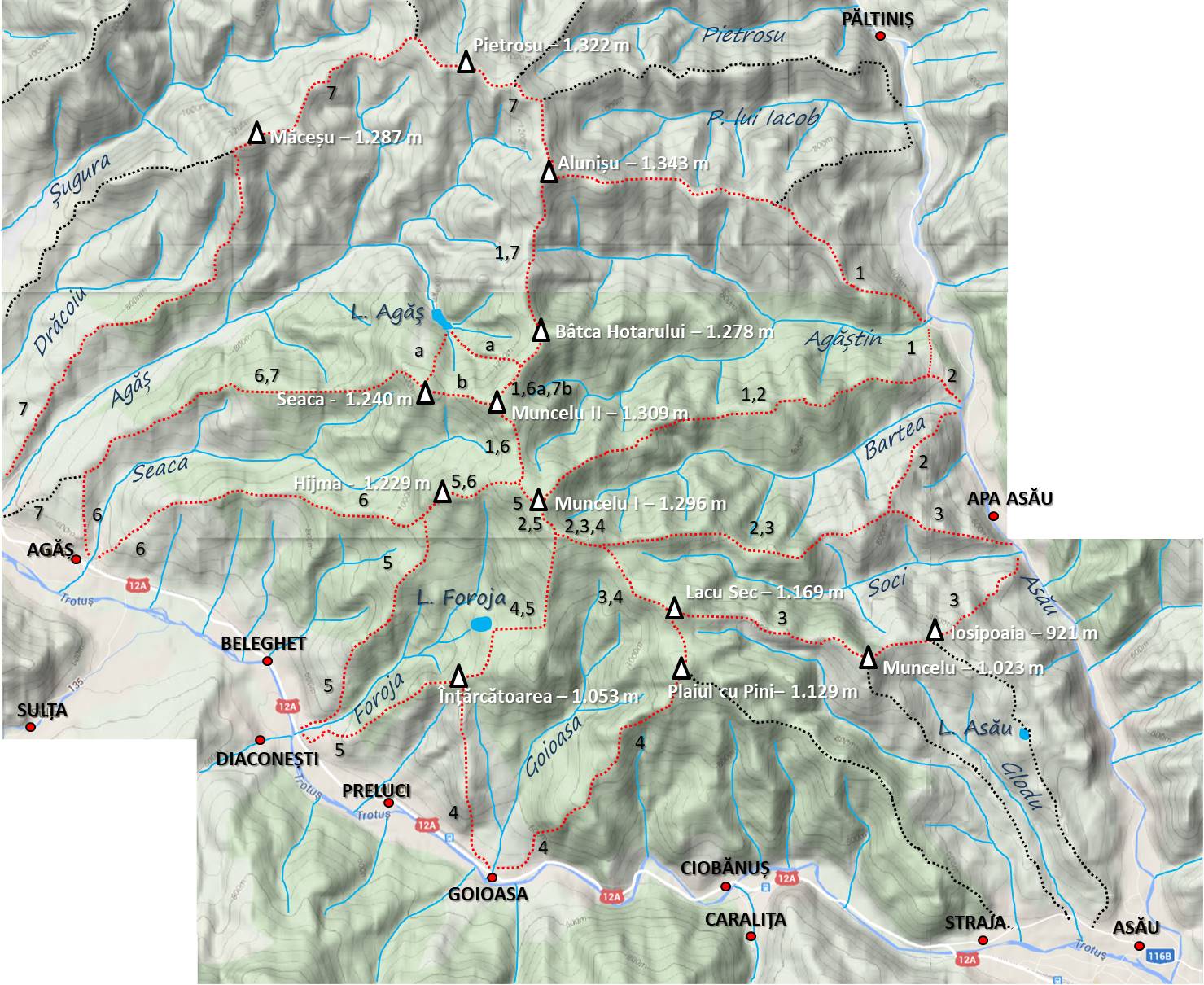 1. Apa Asău (gura Agăştinului) – Plaiul Agăştin – Mt. Muncelu – Mt. Falca Porcului – Mt. Aluniş – Plaiul Arşiţei – Gura Agăştinului