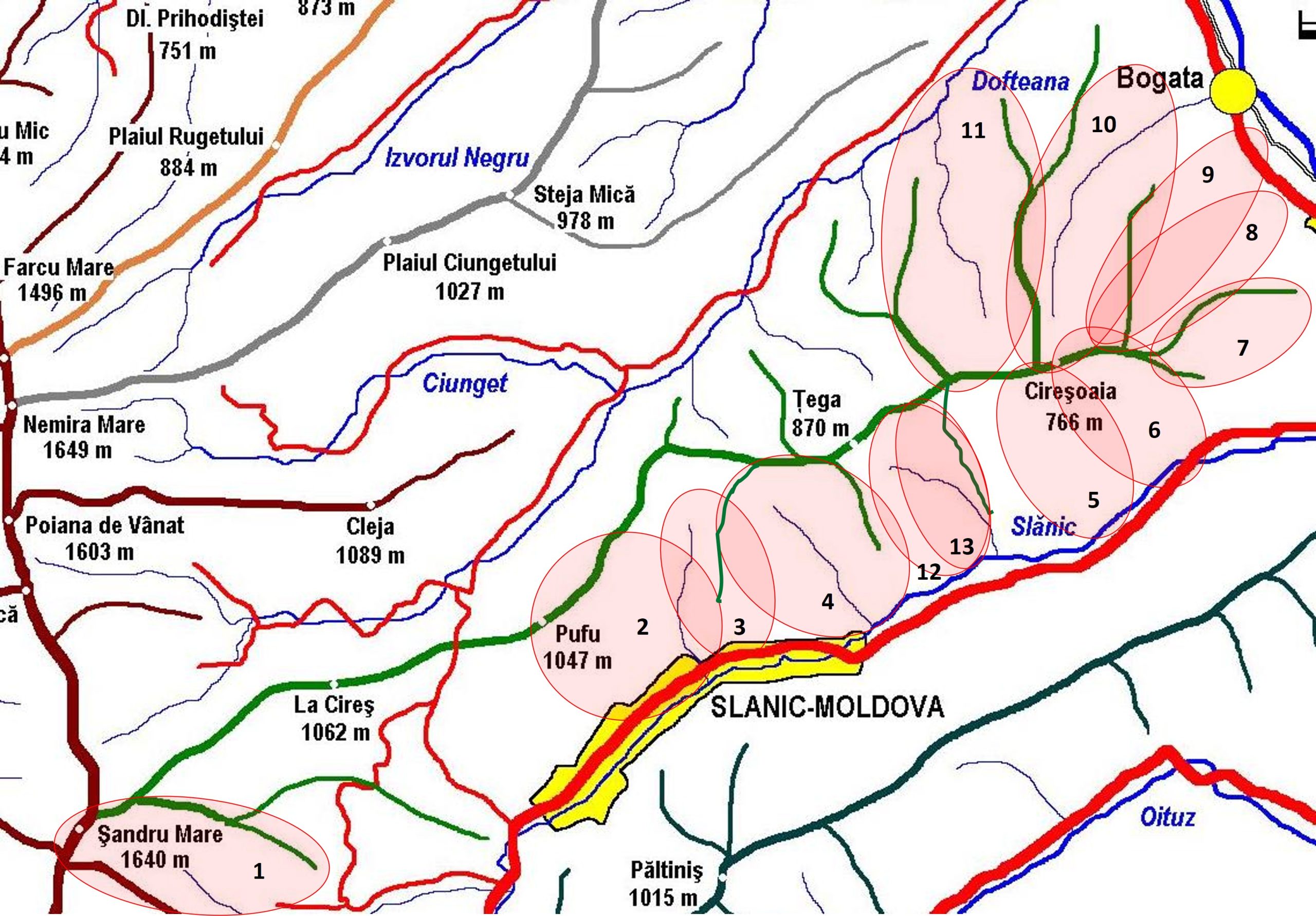 6. Slănic-Moldova – Piciorul Pescarului – Mt. Mic – Vf. Ghepar – Vf. Ceangău – Vf. Capul Vitei – (Vf. Şandru Mare –) Poiana Căprioarei – Piciorul Căprioarei – Slănic-Moldova (*)