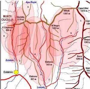– prima, pe care am numit-o “Muntele Mic – Caraslău Mare”, pleacă din Vârful Ghepar şi formează un important interfluviu, separând două subbazine majore ale bazinului hidrografic al Trotuşului: al Oituzului şi al Slănicului. Acesteia i se adaugă pe baza aceluiaşi criteriu oro-hidrografic, plaiul “Păltiniş – Coşna” – un lung braţ desprins din Vârful Muntele Mic;