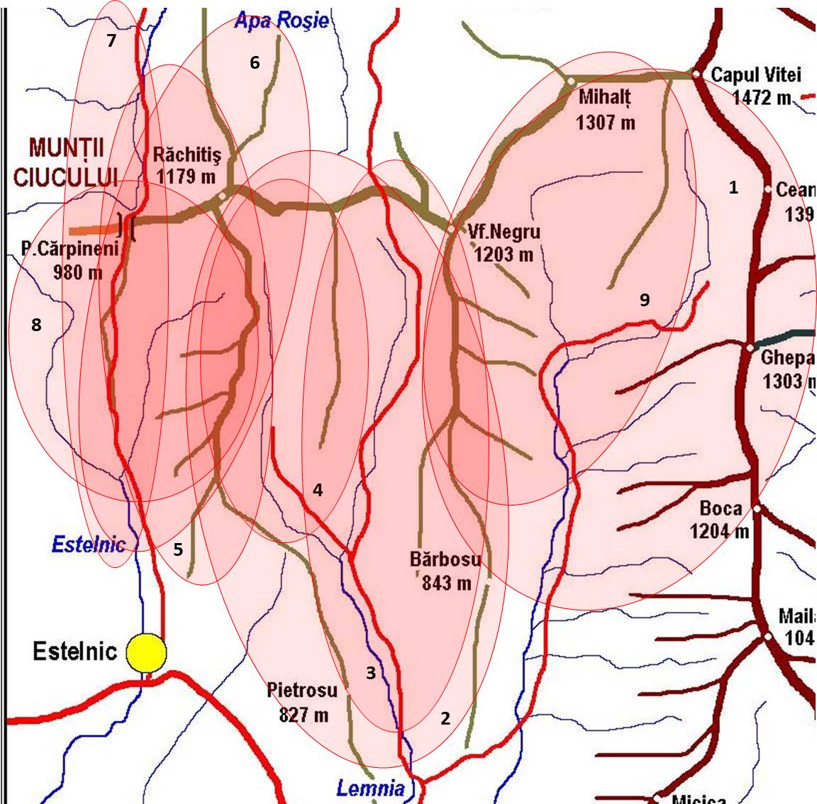 7. Lemnia (Valea Pârâului Negru) – Mt. Trecătoarea – Mt. Boca – Mt. Ghepar – Mt. Ceangău – Mt. Capul Vitei – Mt. Mihalț – Mt. Negru – Mt. Carhago – Mt. Mesteacănu – Valea Pârâului Negru (**)