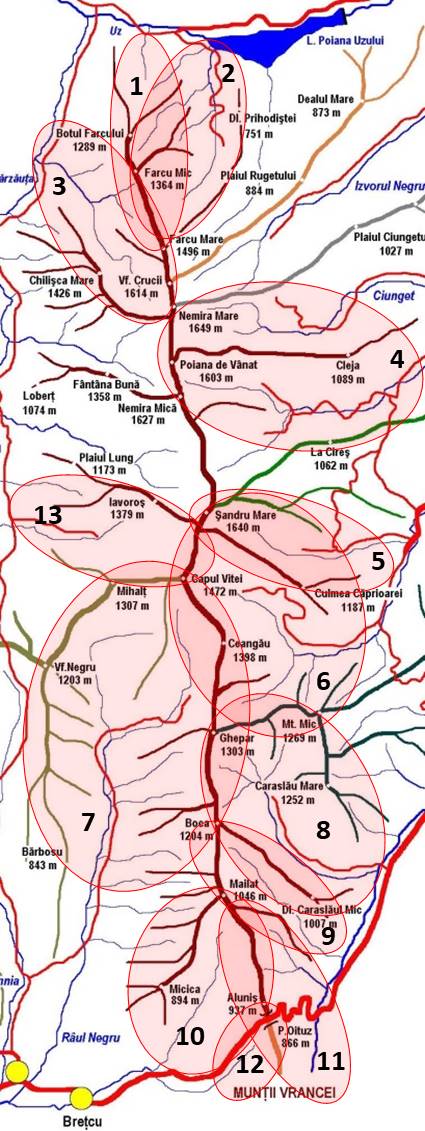 1. Traseul crestei principale: Pasul Oituz – Vf. Mailat – Vf. Boca – Vf. Ghepar – Vf. Ceangău – Vf. Capul Vitei – Vf. Şandru Mare – Vf. Nemira Mică – Vf. Nemira Mare – Vf. Farcu Mare – Vf. Farcu Mic – Vf. Botul Farcului – “La Chibritărie”