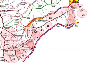 2. Pe Traseul crestei morfologice a Carpaților Orientali (din Munții Vrancei/Pasul Oituz în Munții Ciucului/Pasul Cărpineni): Pasul Oituz – Vf. Mailat – Vf. Boca – Vf. Ghepar – Vf. Ceangău – Vf. Capul Vitei – Vf. Mihalț – Mt. Negru – Vf. Răchitiș – Pasul Cărpineni
