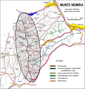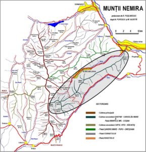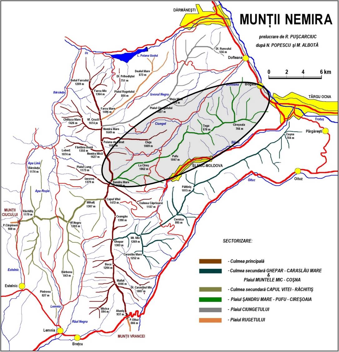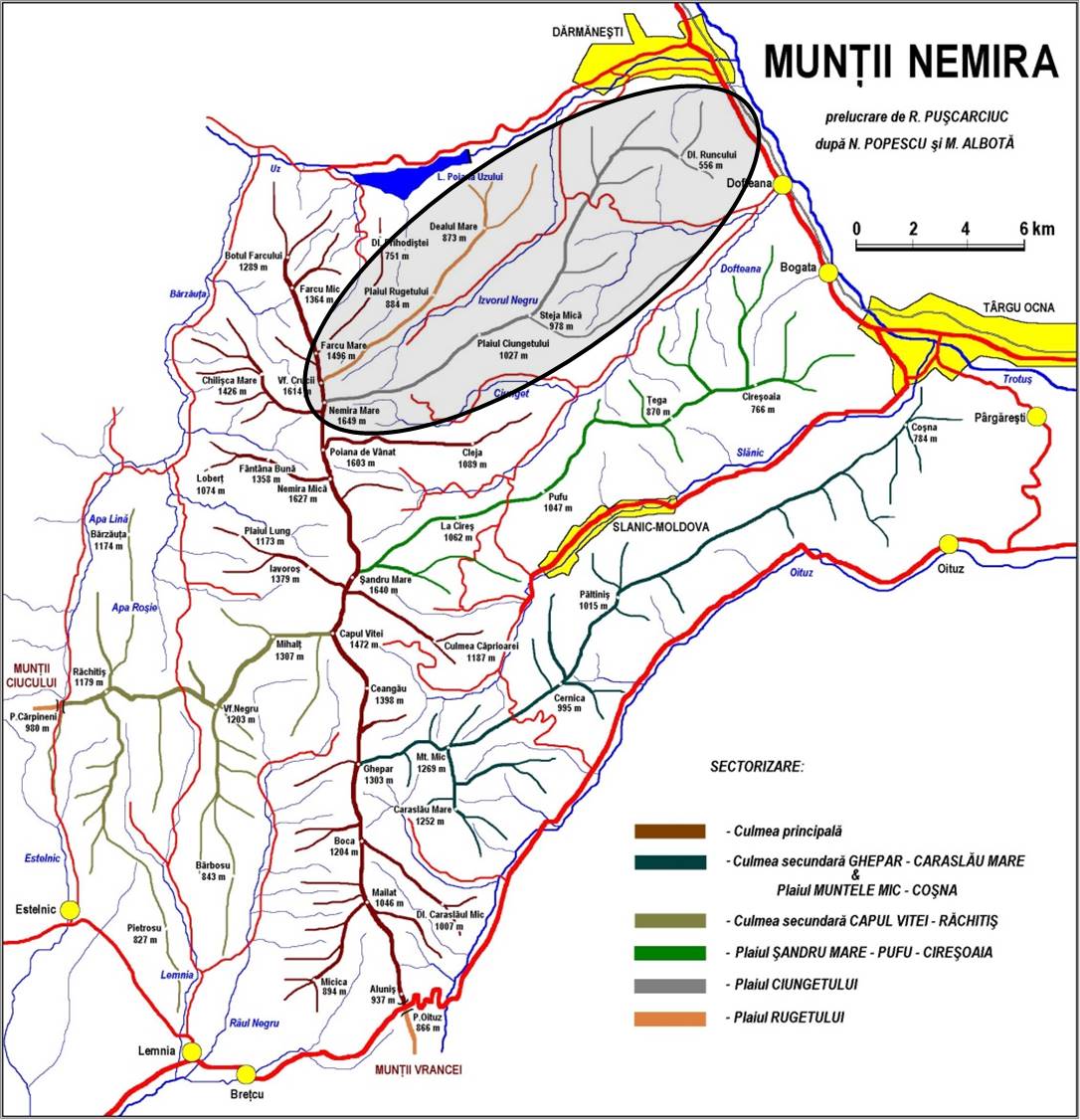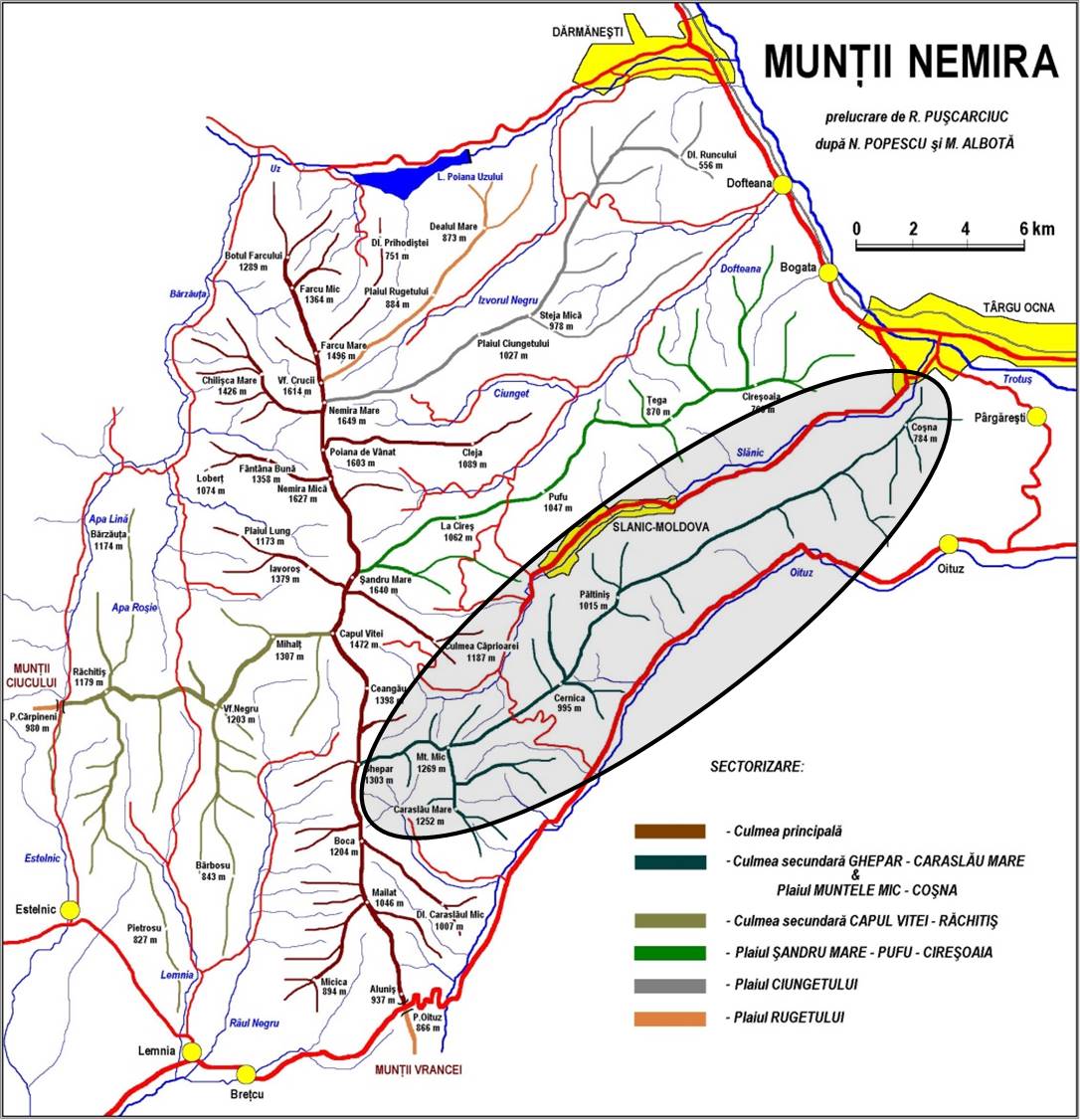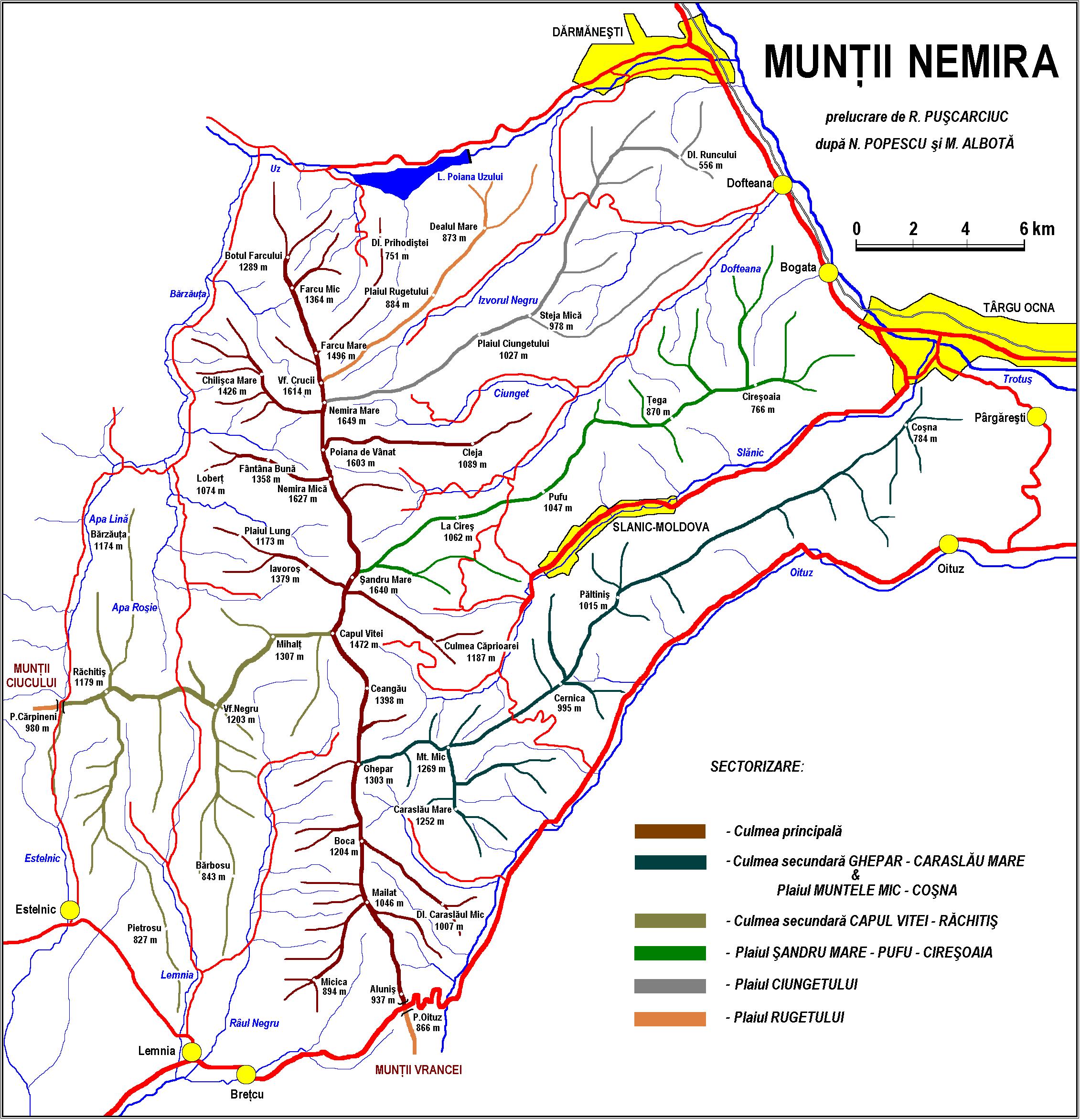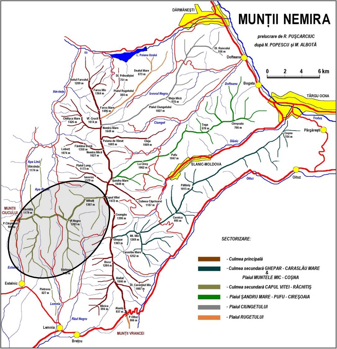 Am numit “culme principală” chiar culmea principală, aşa cum este ea evidenţiată din punct de vedere orografic şi cum apare descrisă în toate monografiile dedicate Munţilor Nemira: începe din sud, din Pasul Oituz, şi se termină în nord, cu căderea bruscă de pantă dinspre valea Uzului, prin culmea Botul Farcului. Am integrat în “culmea principală” şi toate contraforturile ei vestice.