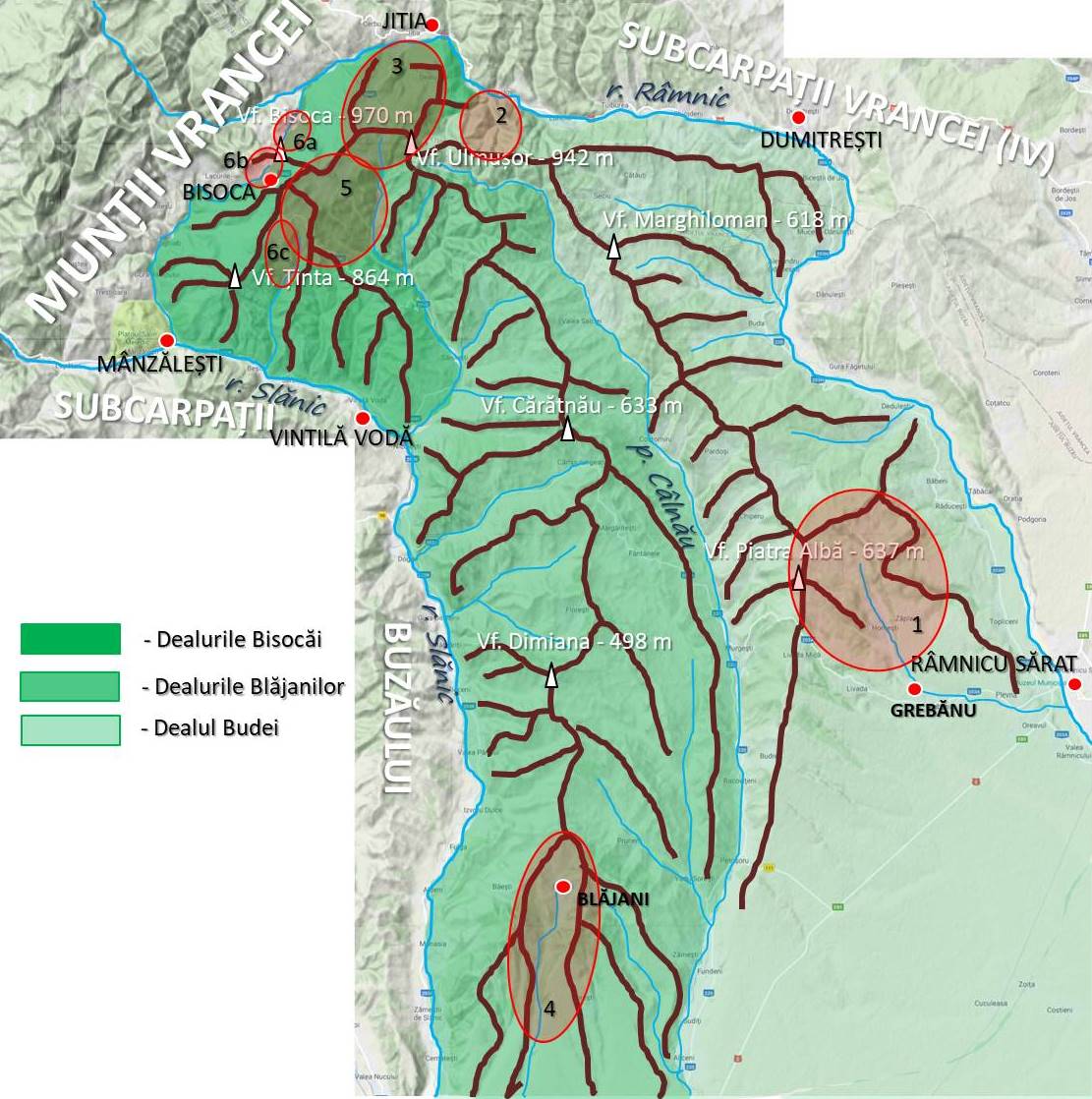a. Dealurile Bisocăi, care leagă substructura de cea montană prin șaua dintre pâraiele Moldoveanul>Râmnicu Sărat și Lopătăreasa>Jghiabu>Slănic, …