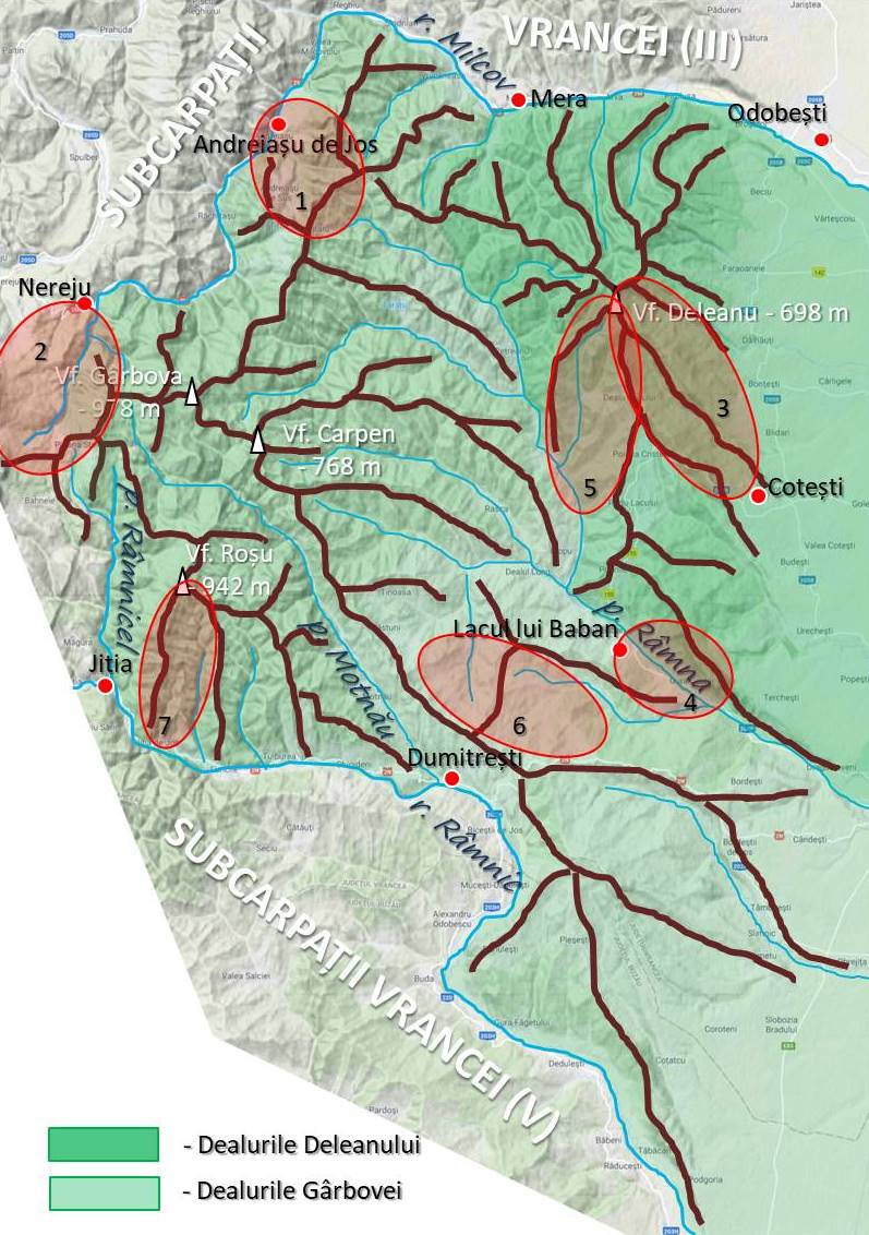 – am exclus din acest interfluviul, ca substructură, Dealurile Tihăraielor pe care le-am înglobat Munților Vrancei, ca prelungiri terminale ale Zboinei Negre !