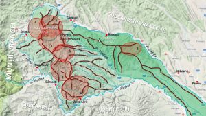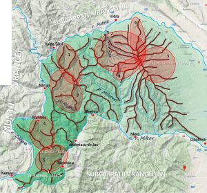 harta: Viorel Chendeș (Resursele de apă din Subcarpații de la Curbură. Evaluări geospațiale, Edit. Academiei, București, 2013)