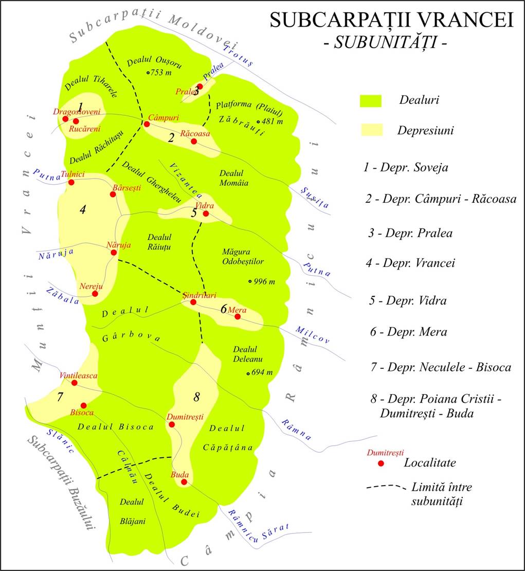Componentă a Subcarpaților de Curbură – un complex de forme de relief pozitive (dealuri) și negative (depresiuni) complicat datorită neotectonicii locale foarte … complicate – Subcarpații Vrancei ocupă cea mai mare parte (40%) din suprafața suprastructurii, având ca limite, la vest (Carpații) și est (Câmpia Română) “naturale” – din punct de vedere geografic, desigur -, dar la nord (Trotușul) și sud (Slănicul) convenționale ! Menționăm că pentru stabilirea limitei vestice am optat, pe de o parte – în mare -, pentru cea care este relativ consacrată în literatura de specialitate (deși nu există consens), dar, pe de altă parte – când a fost vorba de localizări de amănunt -, am ales drept criteriu principal pe cel morfologic, mai precis, am trasat frontierele exclusiv de-a lungul văilor, racordurile dintre acestea – confluențe sau șei pe interfluvii – fiind impuse de cerința păstrării continuității morfologice a culmilor interfluviale. Interesul nostru a fost, cum am mai tot precizat, preponderent, turistic, dar și, substanțial, metodico-comprehensiv !