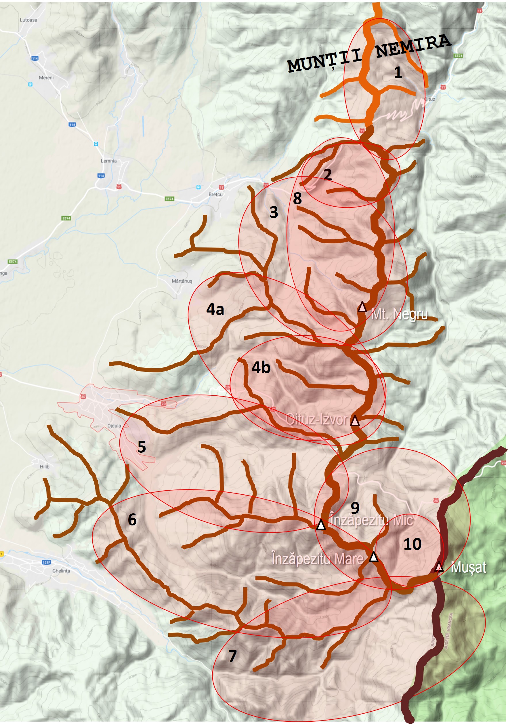 a. – al <Crestei Carpaților>: Pasul Oituz – Vf. Negru – Vf. Oituz-Izvor – Vf. Înzăpezitul Mic – Vf. Înzăpezitul Mare – Vf. Stogul Mic – Vf. Stogul Mare – Vf. Zârna – Mt. Pilișul Covasnei – Vf. Chiuzul Păpăuți – Culmea Cătanelor – Vf. Poienii – Șaua Mlăștinoasă