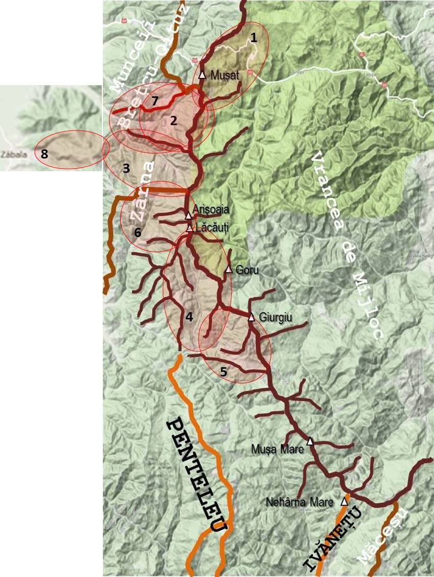 – central, o rețea arborescentă de interfluvii, … realizare a “marilor” rîuri ale Vrancei: Putna și afluenții săi, Tișița, Năruja și Zăbala (VI).