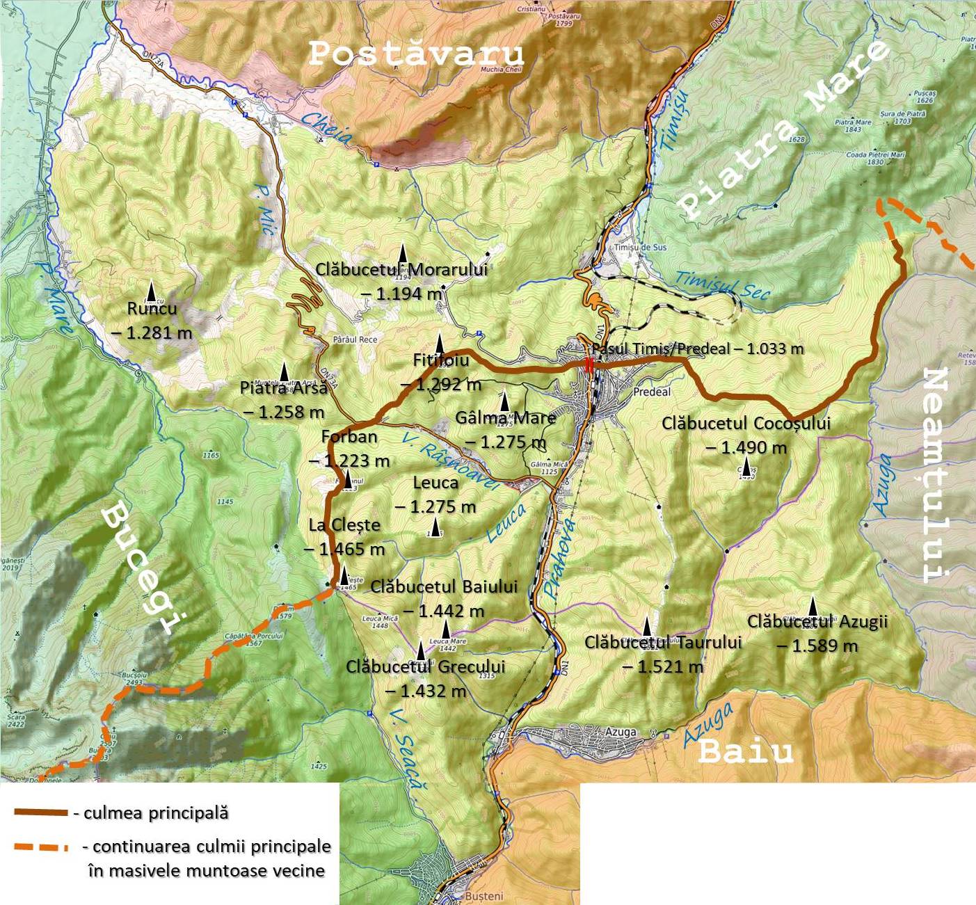 1. PREDEAL (Valea Râșnoavei-Monumentul Eroilor) – pe sub Mt. Gâlma Mare – Vf. Fetifoiu – La Șipote – Mt. Forban – Șaua Baiului – Vf. Leuca Mică – Vf. Grecu – Vf. Leuca Mare – Culmea Clăbucetului Baiului – Monumentul Eroilor (**)
