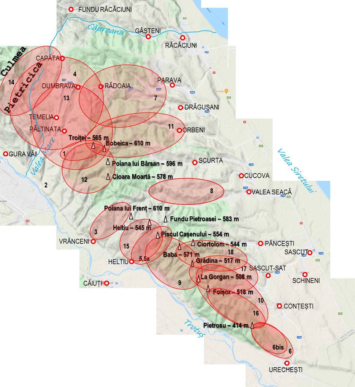 – Culmea Pietricica propriu-zisă, limitată la sud de Valea Mare și Căpreanu, pe care am subîmpărțit-o în Pietricica-nord și Pietricica-sud, despărțite de Orășa și Negelu;