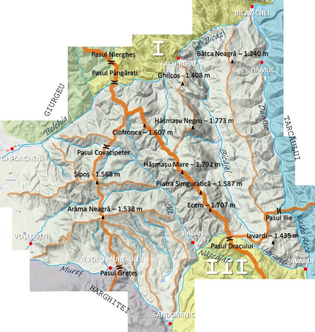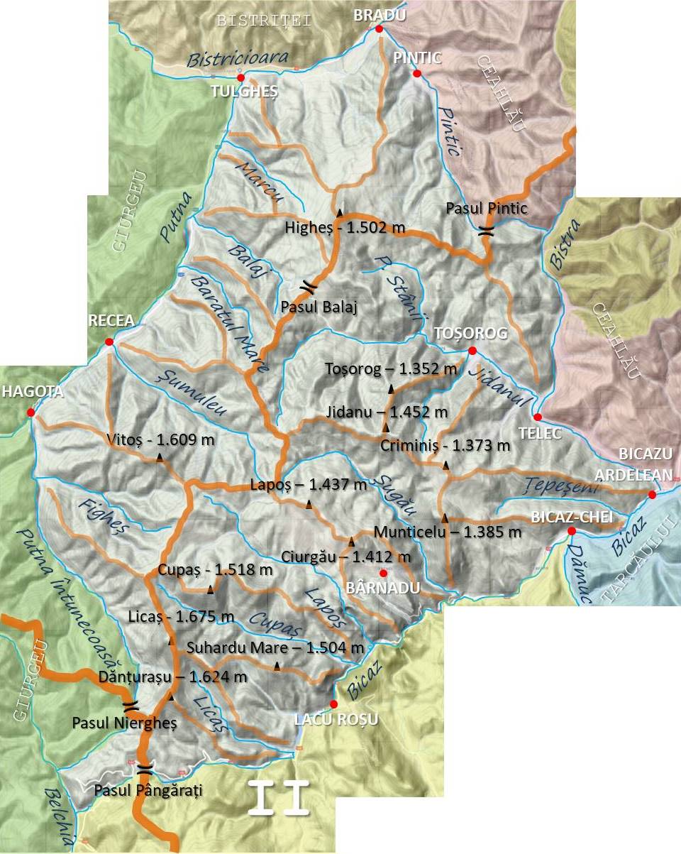 I – cea nordică, formată dintr-o culme mai importantă, ce are continuitate în Masivul Ceahlău și care cuprinde cel mai înalt vârf din regiune, Licașul, dar și pe unul dintre cele mai pitorești, Higheșul; alte vârfuri importante – din aceleași două puncte de vedere – sunt: Suhardul Mic, Suhardul Mare, Dănțurașul, Cupașul, Vitoșul, Jidanul, Criminișul, Munticelul !