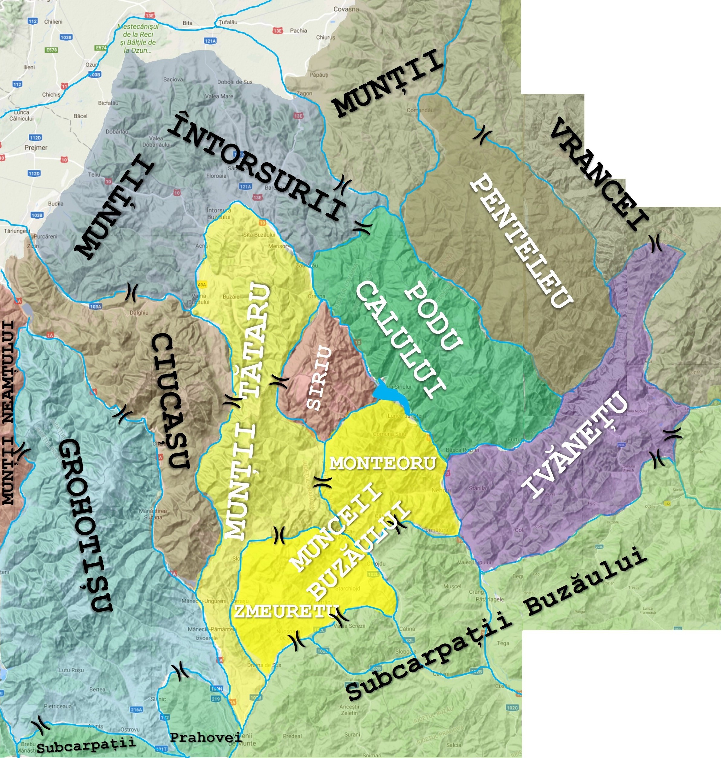 Sintagma “Munții Buzăului” are, în geografie și, implicit, în turism, o accepțiune mult mai … convențională – prin caracterul ei … heteroclit – decât, ceea ce în general exprimă sintagmele similare, asociate marii majorități a celorlalte masive muntoase din Carpații României. Mai precis, geografii (de exemplu, Alexandru Roșu – în Geografia fizică a României, Edit. Didactică și pedagogică, București, 1980 – sau Gr. Posea și M. Ielenicz – în Munții Buzăului. Ghid turistic, Editura Sport-Turism, București, 1977) înglobează în munții Buzăului Tătarul, Siriul, Podul Calului, Penteleul, Ivănețul, Monteorul și Zmeuretul. Din motive de simplificare a sistematizării traseelor parcurse de noi prin acești munți, am preferat să tratăm separat fiecare dintre aceste masive muntoase, cu excepția ultimelor două, pe care le-am considerat ca alcătuind Munceii Buzăului.