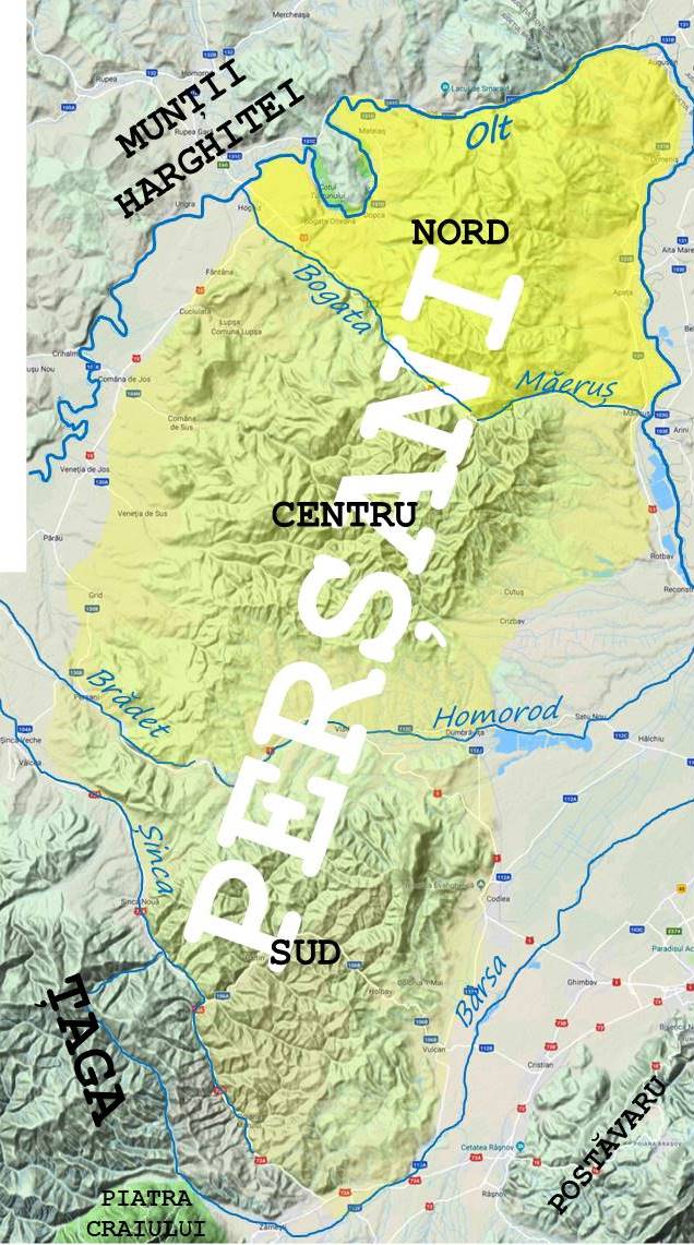 Marea suprafață pe care o ocupă, varietatea reliefului și fragmentarea impun divizarea lor. Autorul citat îi împarte în trei compartimente: Nordicii (aflați la nord de Defileul Oltului de la Racoș, dar pe care noi i-am înglobat în Munții Harghitei, cum o face, pe hartă, însă nu în text, chiar autorul), Centralii, cuprinși între Olt și valea Homorodului, din care noi am extras regiunea cuprinsă între Olt și Măeruș-Bogata, numind-o Perșanii Nordici, și Sudicii, între Homorod și Bârsa-Șinca.