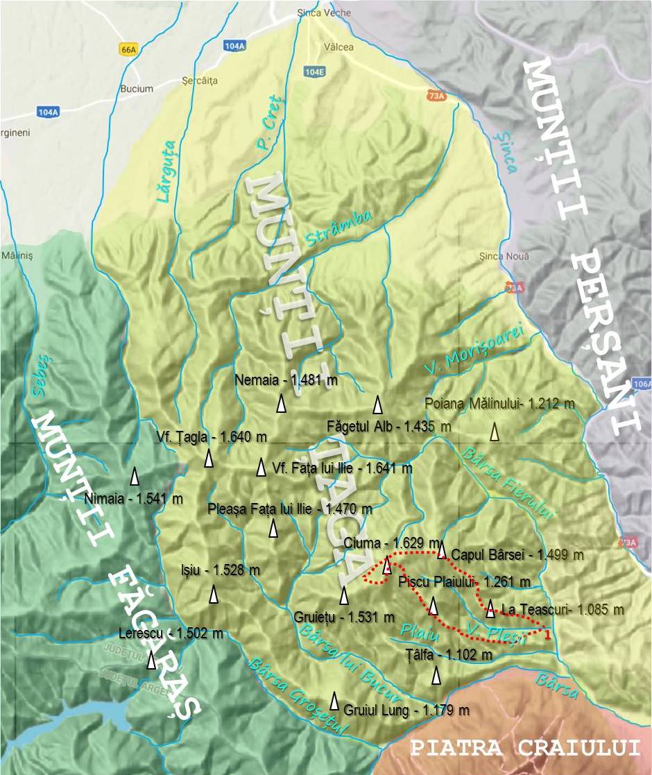 1. Gura Văii Pleșii – Mt. Teascuri – Mt. Capu Bârsei – Vf. Ciuma – Plaiul Ciumei – Piscu Plaiului – Mt. Plaiul – gura Văii Pleșii (**)
