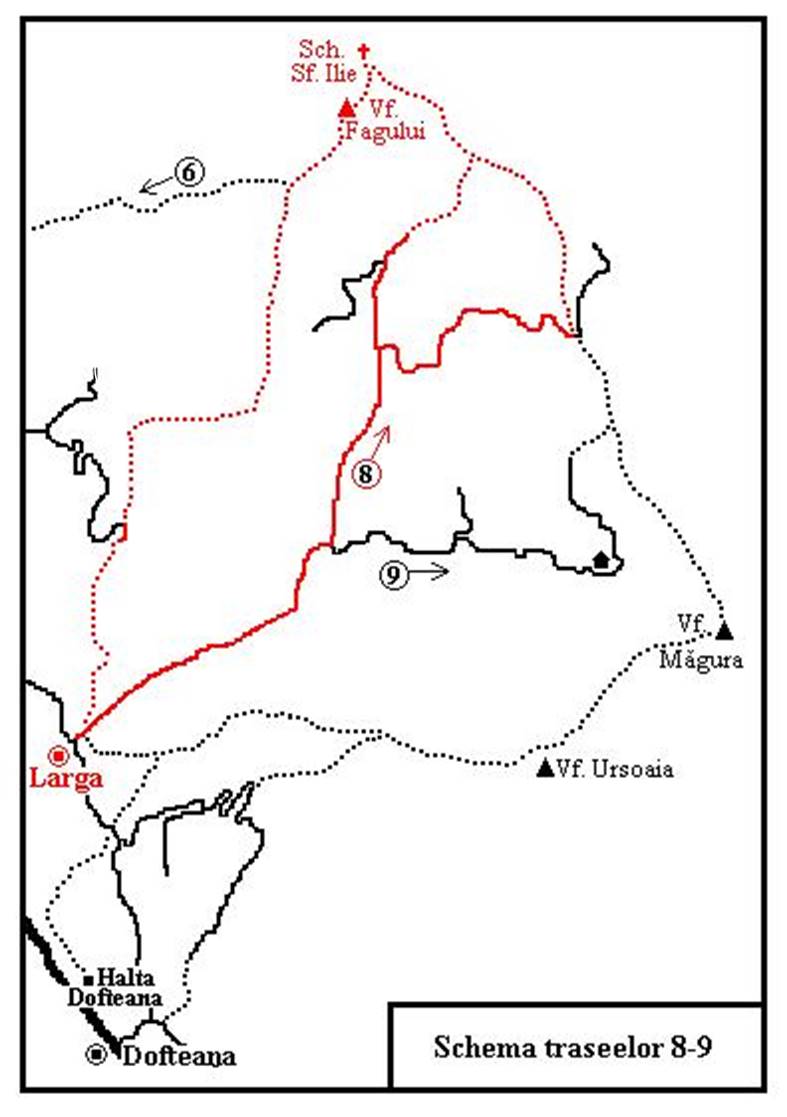 f) Dacă de la borna VIII 138 nu cotim spre dreapta, refuzând varianta e, rămânem pe culmea Fagului, cea marcată cu „H”-uri, esenţiale mai departe pentru orientare. Ne ajută mai ales acolo, unde poteca, bine conturată de altfel, mai lasă culmea pentru a ocoli câte un vârf prea povârnit; în astfel de situaţii e bine să nu pierdem „H”-urile din ochi, sau măcar poziţia lor presupusă, ele aflându-se mereu în stânga noastră, pe linia de cea mai mare altitudine a culmii. De altfel, poteca va tot şerpui, dar în plan vertical, pe muchia Plaiului Fagului, urcând vârfuri (vreo patru) şi coborând în şeile dintre ele, circa o oră. Drumul, doar prin pădure, poate să ni se pară monoton. Nu întru totul; putem remarca, de pildă, căci trecem pe lângă el, un uriaş gorun, bătrân de vreo două sute de ani. E singur, strâns înconjurat de mulţime de fagi trecuţi şi ei de prima tinereţe; par să-l străjuie, cum altfel, decât cu respect, veneraţie şi admiraţie! Cum să fi arătat oare codrul pe vremea tinereţii lui? Ieşim în cele din urmă din pădure la marginea unei păşuni, vălurite de viroagele obârşiei unui pârâu, al Ursului, afluent al Văii Larga. Priveliştea se deschide larg către Valea Trotuşului aflată la confluenţa cu Valea Uzului. Trecem în revistă localităţile paralele cu cele două văi: de la dreapta, Dărmăneşti, Păgubeni, Larga, Dofteana. Continuăm drumul, ocolind obârşia pârâului, trecem pe versantul său drept şi coborâm către botul de deal care domină gura vaii Larga. Se distinge bine linia sinuoasă a unui fost drum petrolier care mergea la o sondă, dezafectată acum, pe lângă ale cărei urme vom trece, de altfel, dacă optăm pentru varianta g a traseului.