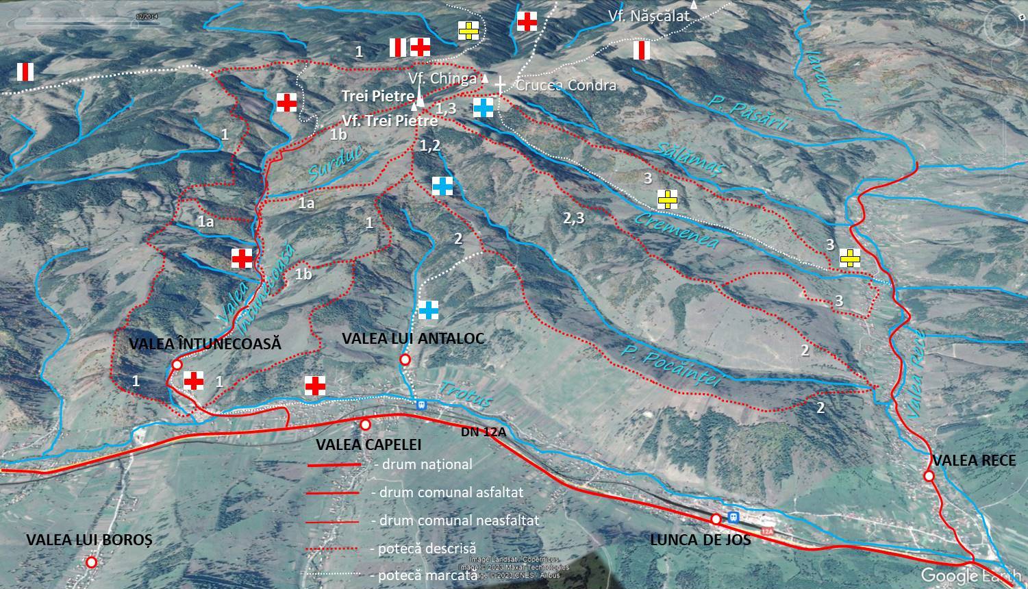 1.b. VALEA ÎNTUNECOASĂ (Gura P. lui Antal) – Valea Întunecoasă -Șaua Chinga – Crucea Condra – Trei Pietre – Vf. Trei Pietre – Culmea lui Antal – Gura P. lui Antal