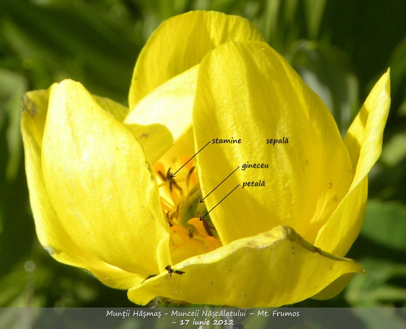 Planta este una dintre cele mai atractive – din punct de vedere estetic, datorită combinației specifice dintre formă și culoare. Vorbind despre formă, ea este rezultatul imbricării celor 10-12 sepale petaloide galbene – cele, vreo 5, exterioare, cu vagi nuanțe sau striuri verzui – ce îmbracă 5-15 petale galbene, mai mici și înguste, de lungimea staminelor, cu funcție nectariferă (nectarii), cam cel puțin tot atâtea stamine ce, la rândul lor, înconjură spiralat …