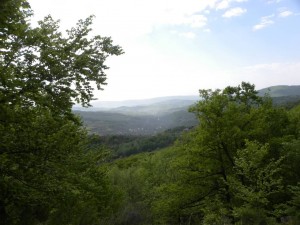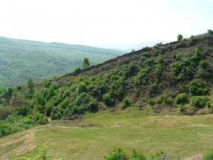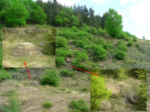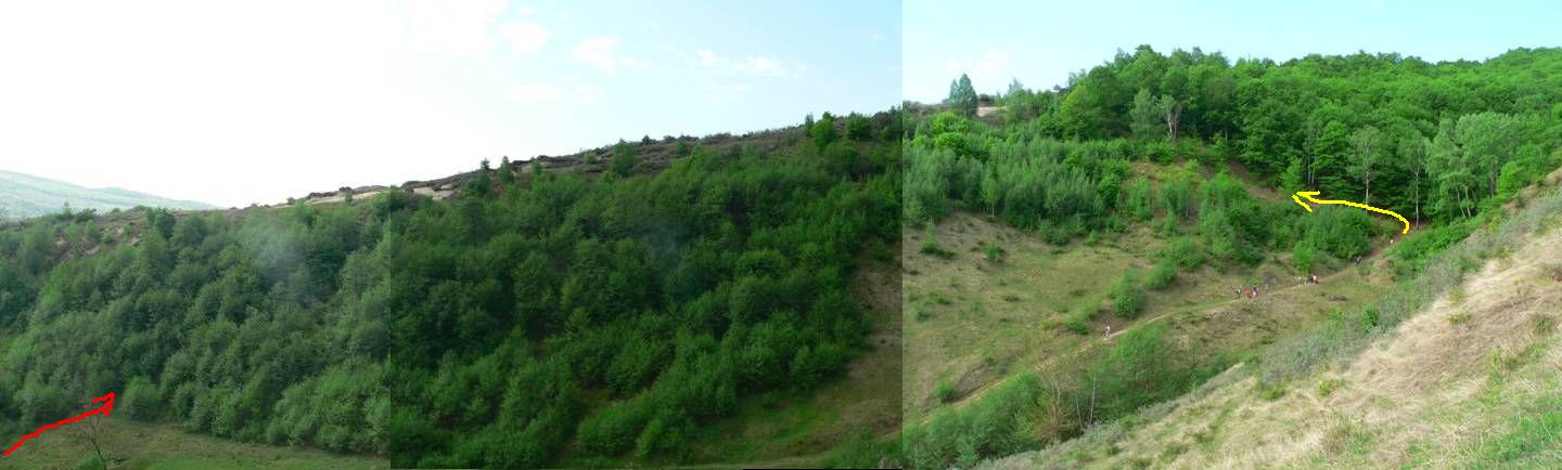 … de unde surprindem o imagine de ansamblu asupra dealului cu trovanţi, aflând şi cam pe unde ar fi trebuit să urcăm pe el (roşu) !