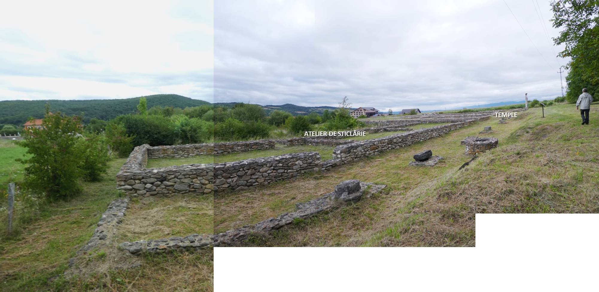 … aleea dinspre stânga ne conduce la un alt mic complex de vestigii: ale unui atelier de sticlărie (o atestă un bulgăre de sticlă arsă, cuptoarel și uneltele găsite aici), …