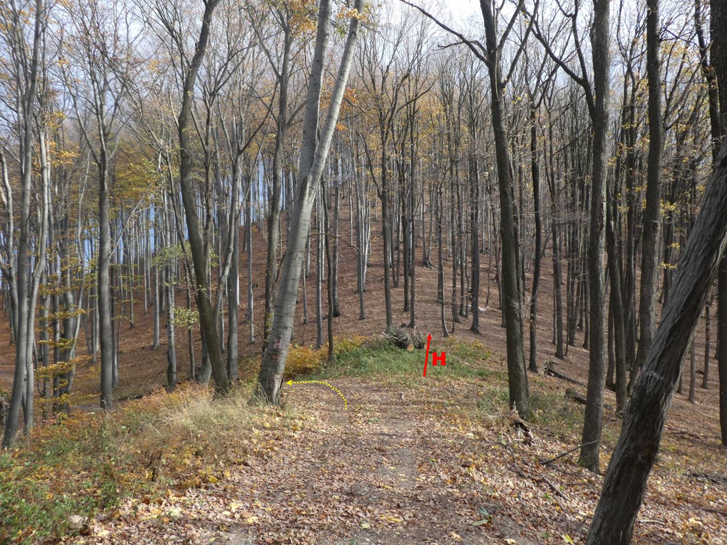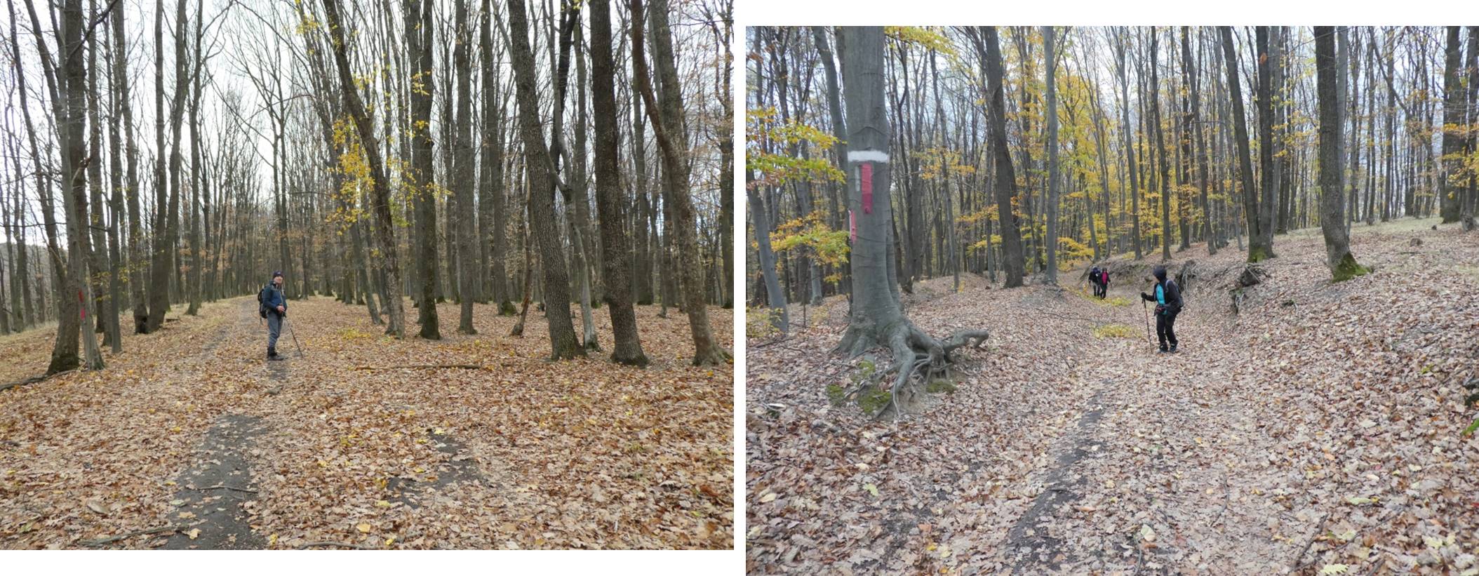 … coborând în fundul văii Ursoaia, un afluent de obârșie al pârâului Orbeni. Urmând același drum ajungem pe versantul drept al Ursoaiei, interfluviu între ea și Trestioara, afluent de obârșie al pârâului Scurta. Rolul orientativ al “H”-urilor silvice îl vor prelua benzile roșii verticale.