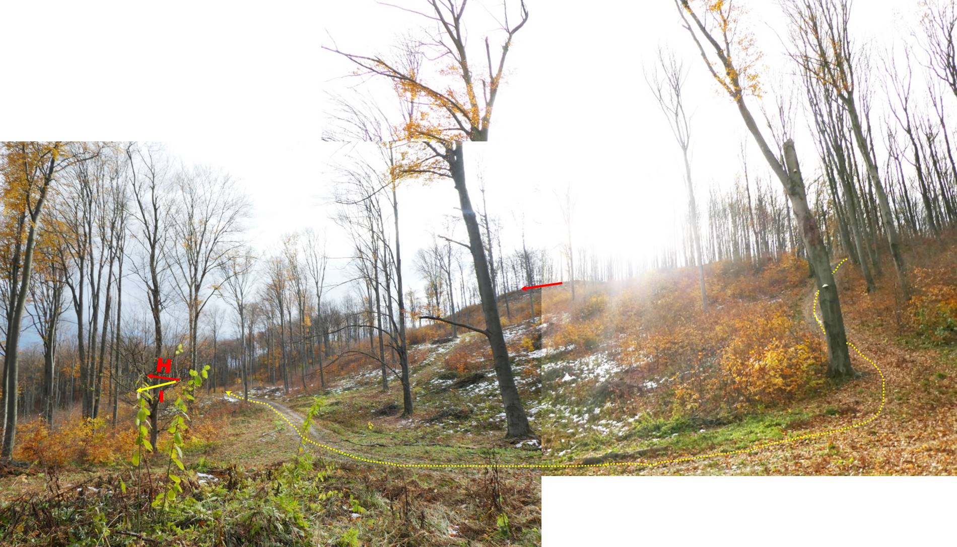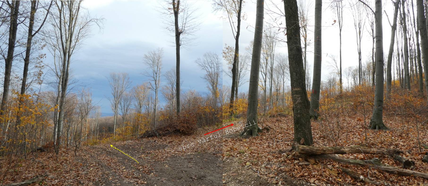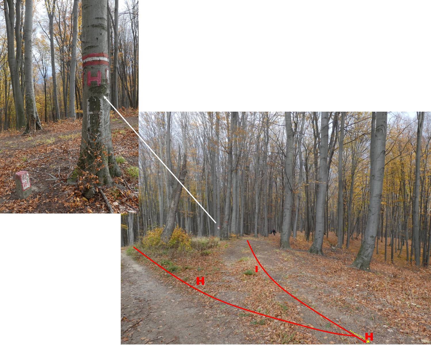 După circa o oră interfluviul pe care am venit se racordează la culmea principală a Pietricicăi. Silvic vorbind, acest aspect geografic este marcat de racordul hotarului dintre parcele la cel dintre ocoale silvice (marcat cu “H”-uri roșii).