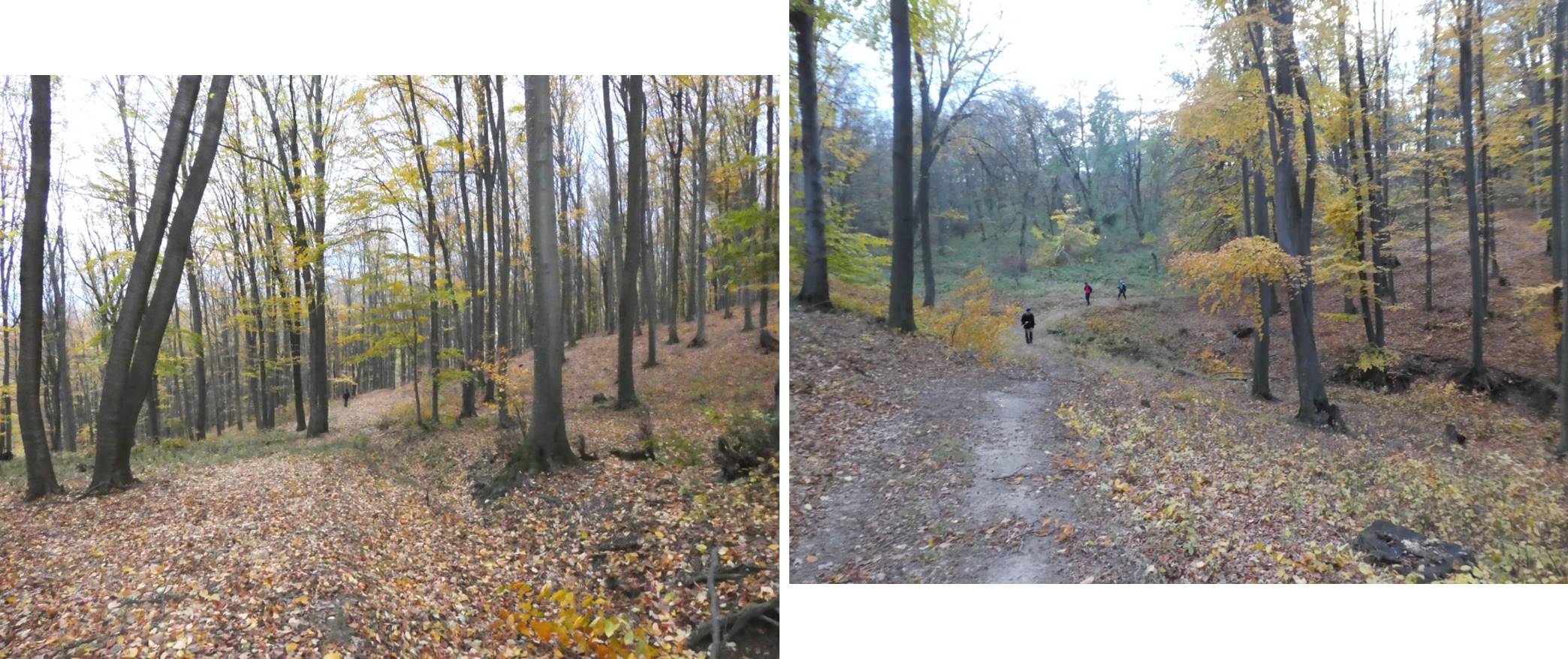 … o părăsim și intrăm în pădure; în punctul ales, descoperim capătul unui drum de căruțe (cândva – când Dealul La Pandelă era acoperit de pășune) pe aici răzbătea din pădure un mănunchi de poteci de oi și un drum de căruțe, dar zona a fost cucerită de o încâceală arbustivă.