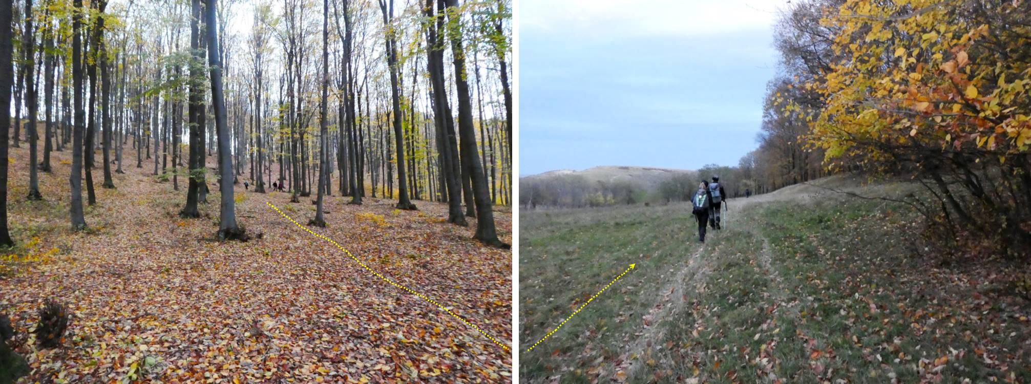 Prin pădure nu e nici o problemă legată de orientare. În ciuda spinării late a interfluviului linia culmii este lesne decelabilă, dar, mai ales, drumul este destul de circulat și, ca atare, ușor de urmărit; se mai adaugă și marcajul silvic al hotarului dintre parcele forestiere, realizat cu benzi roșii verticale.