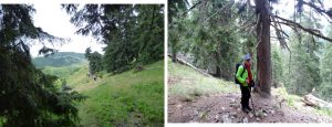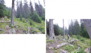 … interesul nostru fiind de a găsi intrarea potecii de oi în pădure. Am găsit stâna părăsită, probabil așa va râmâne și peste ani, ceea ce înseamnă că poteca oilor, încă decelabilă prin pășune, se va estompa cu timpul !