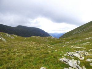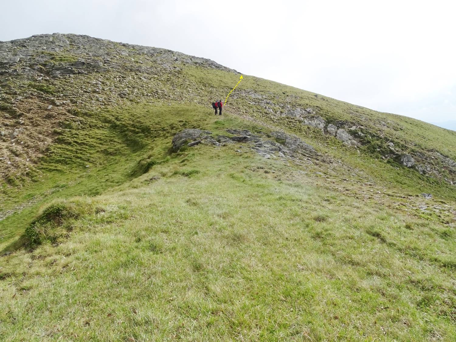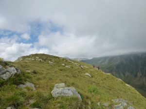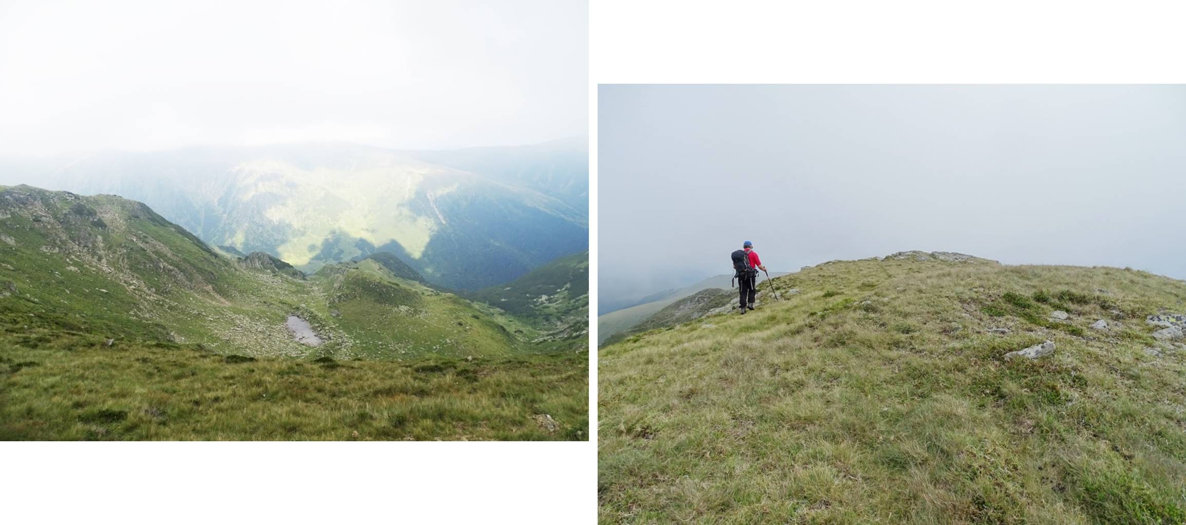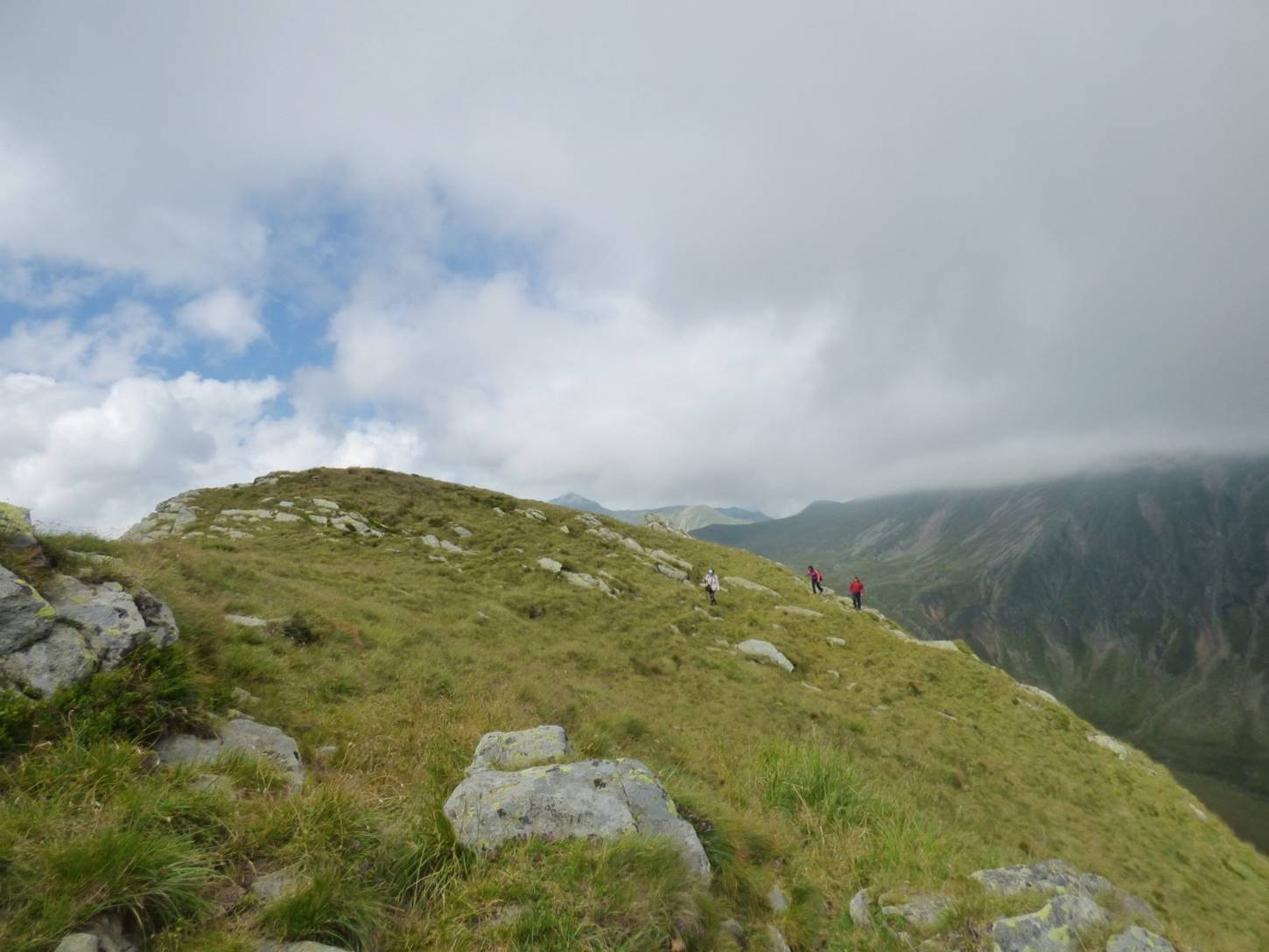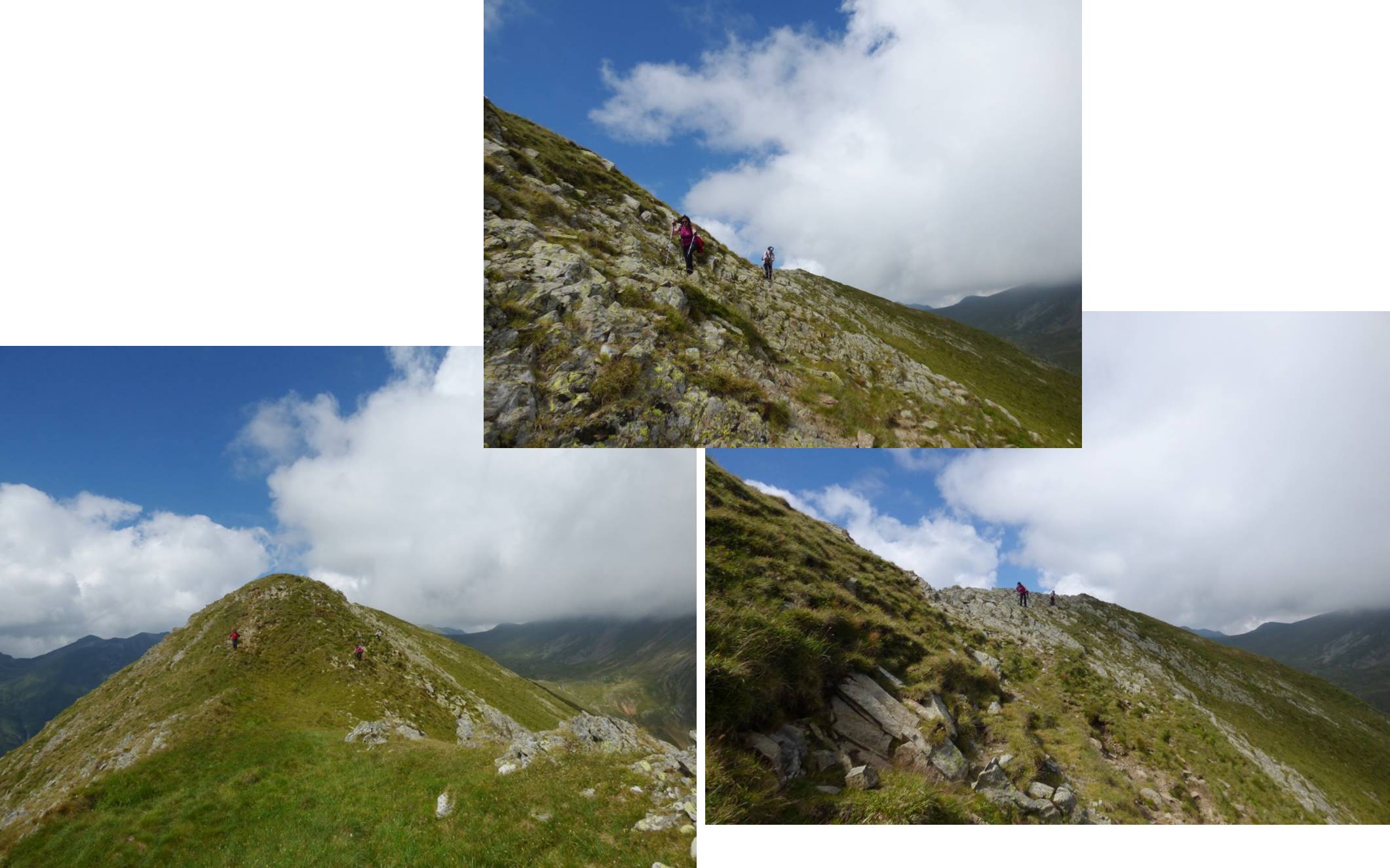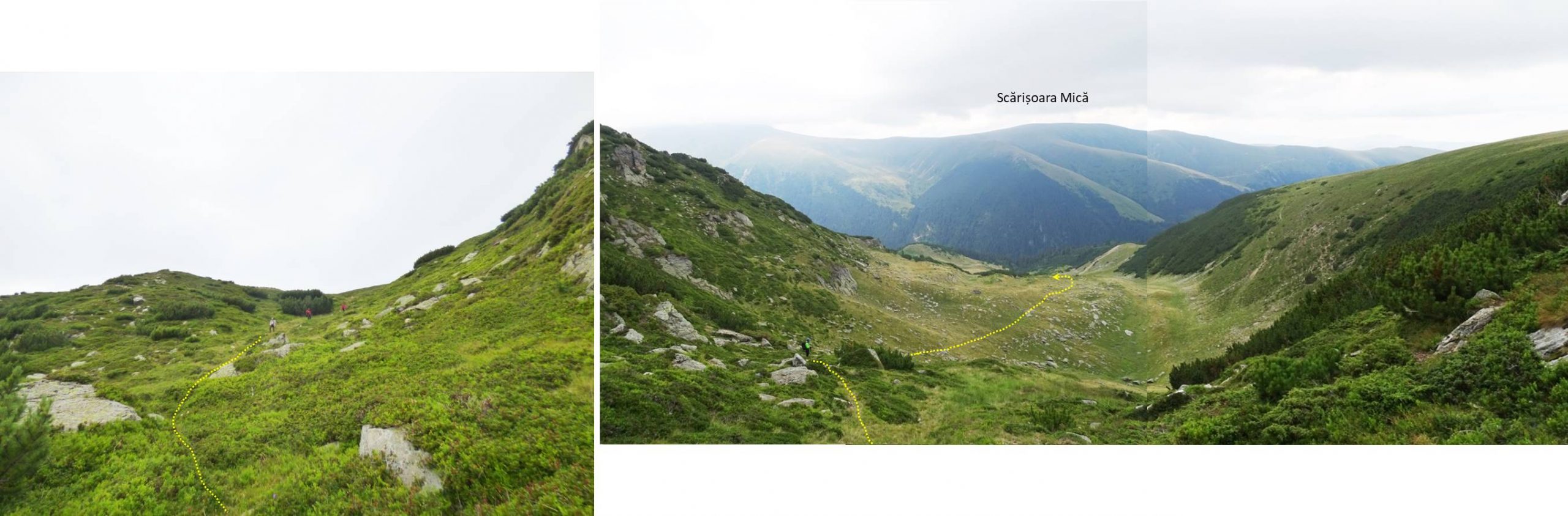 Poteca se lasă puțin sub culme evitând un vârf … inutil de urcat urmat fiind de o șa ce rupe creasta în două !