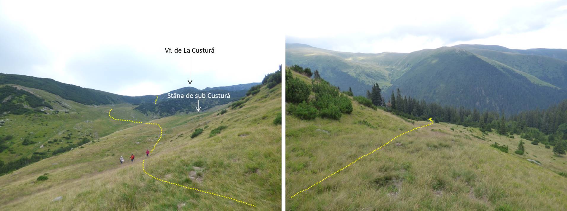 Urmează să coborâm spre stânga chitind marginea căldpării de La Custură și breșa prin care vom lăsa în ea. Din dreptul ei drumul de culme pe care e trasat marcajul cruce roșie cotește cu 90 de grade spre dreapta.