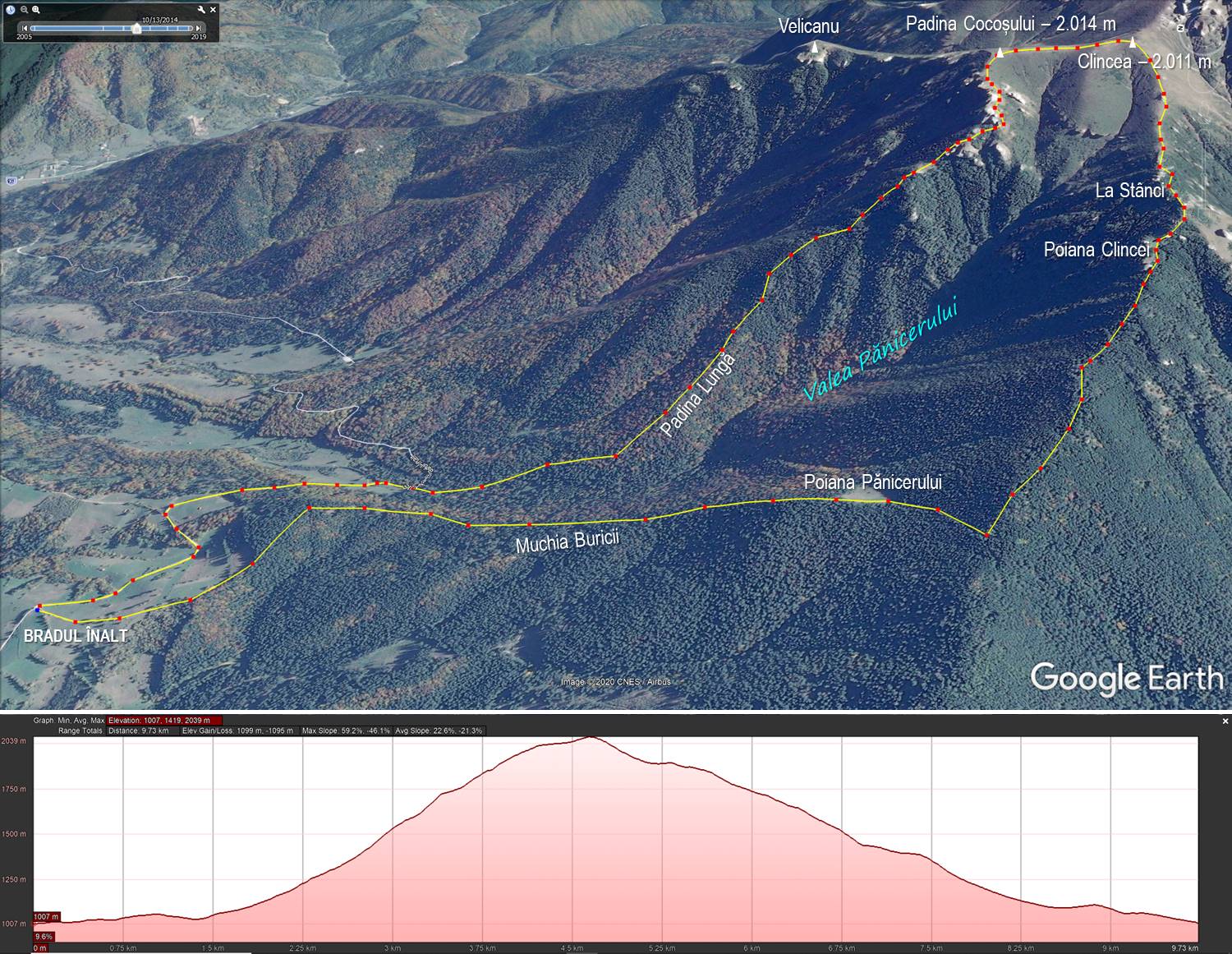 Traseu: Bradul Înalt – Valea Pănicerului – Padina Lungă – Padina Cocoșului – Culmea Clincea – Poiana Pănicerului – Culmea Buricii – Bradul Înalt