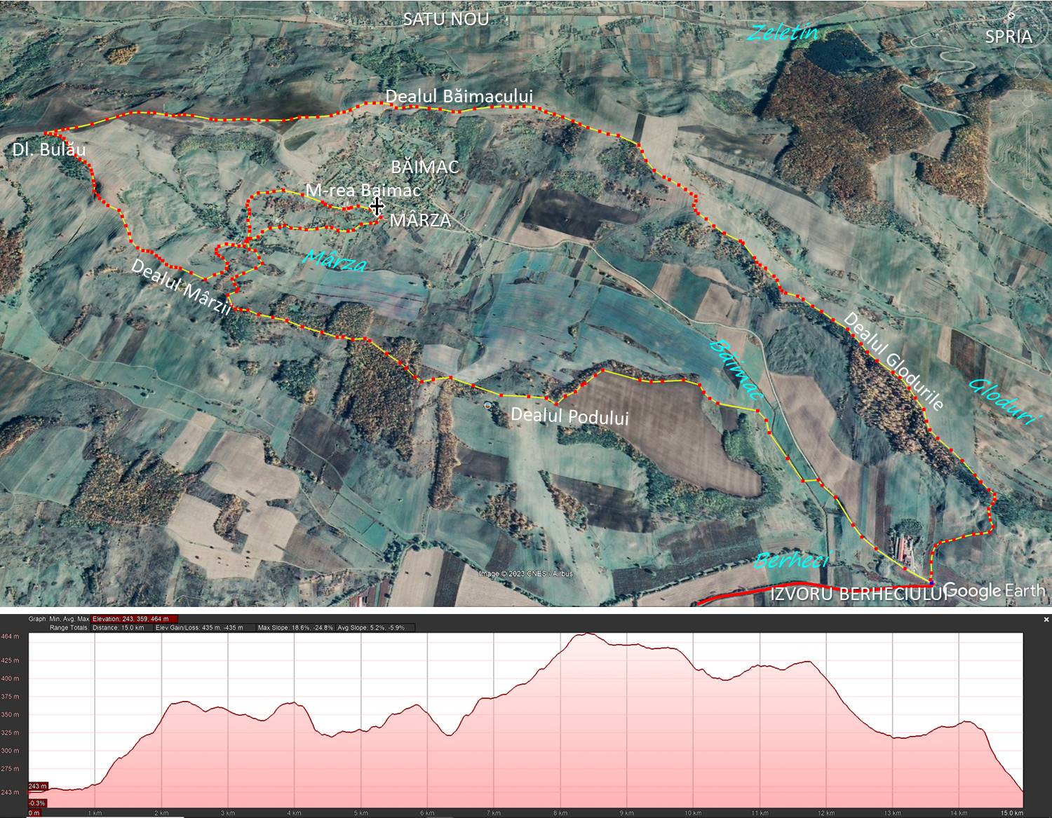 Traseu: IZVORU BERHECIULUI (Gura Băimacului) – Dl. Podului – Dl. Mârzii – M-rea Băimac – Dl. Mârzii – Dl. Bulău – Dl. Băimacului – Dl. Glodurile – Gura Băimacului